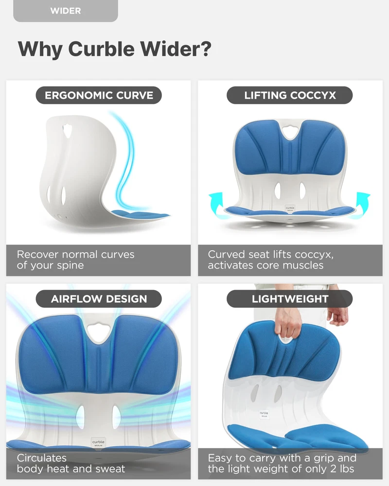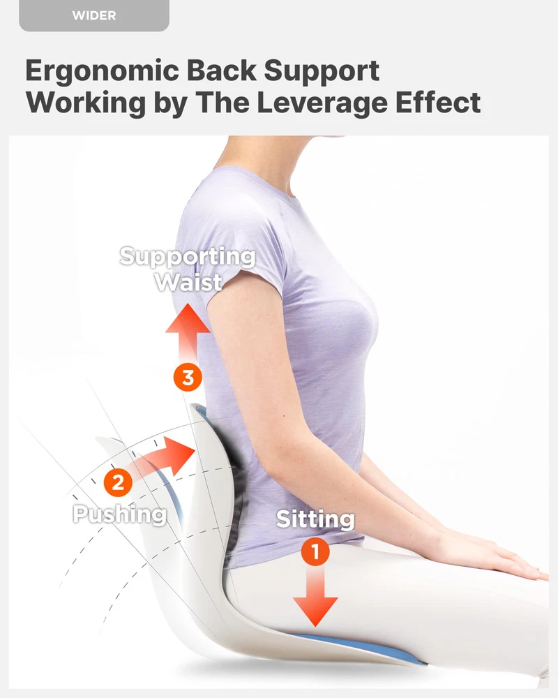 HOW IT WORKS; Working by the leverage effect, the weight of your body naturally pushes your waist for posture correction, It keeps making your body lean forward and sit straight SAY GOODBYE TO BAD SITTING HABITS; Do you often feel tension in your muscles after sitting for a long time? That's because you've probably developed bad sitting habits over time. But with , you can break those habits and start feeling more comfortable - all in just 30 minutes a day for two months! FEATURES; Ergo back support for posture correction, Curved seat for pervis and coccyx lifting, High density foam cushion for comfort, Air holes for ventilation USE EVERYWHERE; Light weight(2 lbs) and easy to use, Put it on an office chair, gaming chair, driving car seat, bed, couch, floor, school chair, desk chair, computer chair, stadium bleacher, etc. DURABLE AND ERGONOMIC; Our chair is built to last! abrasion-resistant material that can withstand up to 600 lbs of pressure without breaking. Plus, the elasticity provides strong and flexible support. RECOMMEND FOR; office workers, students, drivers, teachers, professional gamers, artists, or anyone who is concerned about lumbar or back health and wants to improve posture VALUABLE GIFT; Health is one of the most important factors in life, Chair helps to make good health habits, It will be a valuable addition to your loved ones, her or him