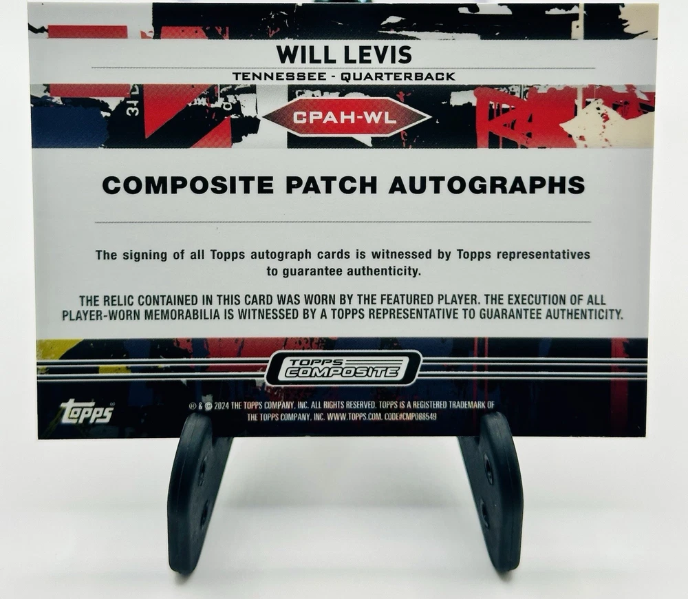 This is a rare and highly sought-after trading card featuring Will Levis, a promising rookie from the Tennessee Titans football team. The card is part of the 2023 Topps Composite - Patch Autographs Horizontal set, and is a single-insert card with a unique serial number. In addition to the autograph, this card also features a patch and is categorized as memorabilia. With its original and authentic design, this card is a must-have for any sports trading card collector. Don't miss out on the chance to add this limited edition Will Levis card to your collection.