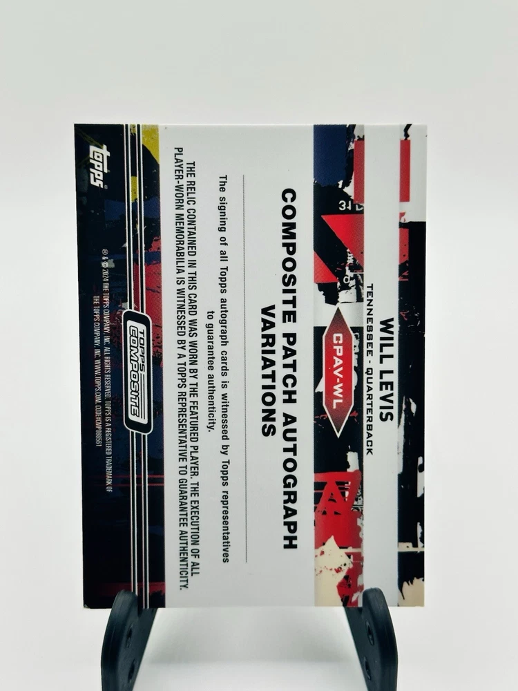 This limited edition 2023 Topps trading card features Will Levis, the rookie player for the Tennessee Titans in the National Football League (NFL). The card is a composite of card stock and has a print run of 99, making it a rare find for collectors. It is autographed by Will Levis and authenticated by Topps. The card is a parallel/variety relic with a vertical design and includes a patch and serial number. As a collector's edition, this card is an exclusive and memorable piece for fans of football and trading cards. It is a short print and includes features such as an insert, chase, and memorabilia. The card is in English and was manufactured in the United States in 2024. It is the perfect addition to any sports trading card collection.