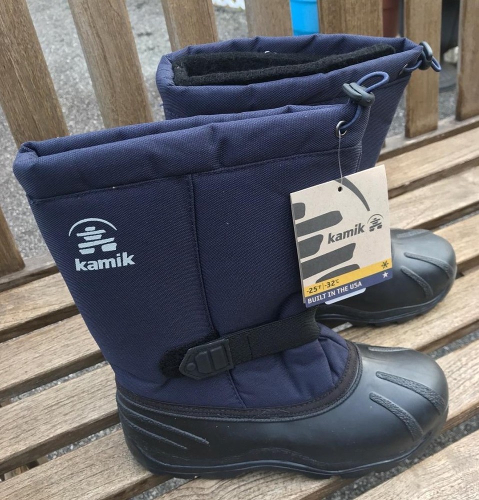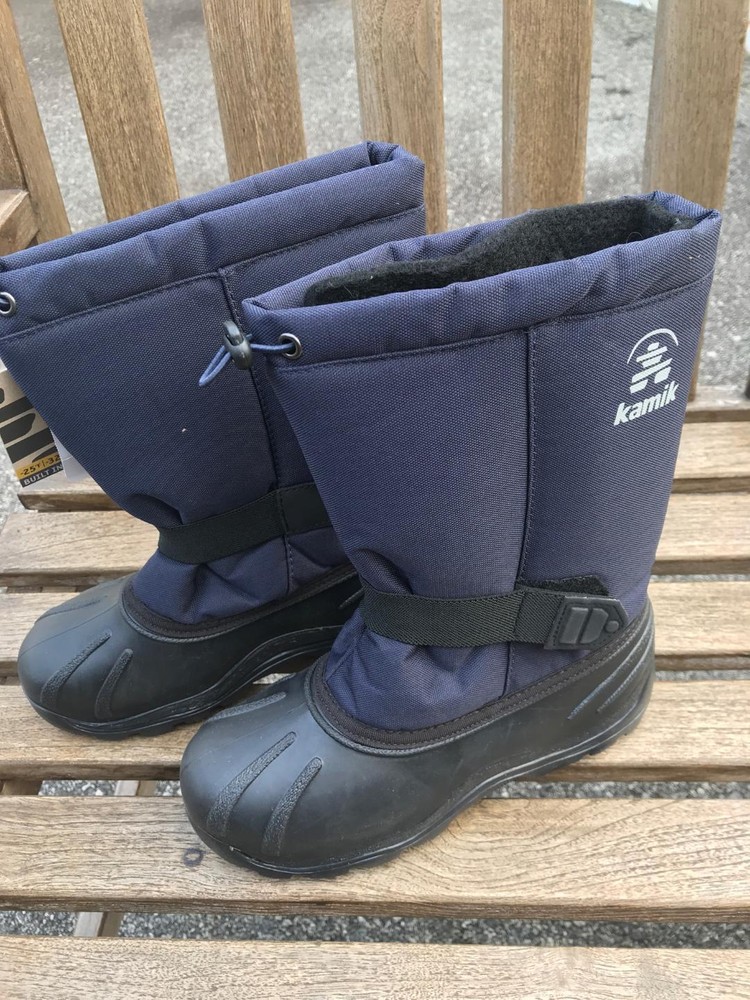 Kamik Boys Lightweight Winter Boots Style - QUEBEC Color - Navy Blue Size - YOUTH Boys USA 5 Kids love snow and Kamik winter boots are made for playing in the snow! Prepare your son for the great outdoors in Kamik's 9 1/2 inch tall navy blue snow boots. Kamik's nylon uppers are waterproof and keep the wet winter weather out, while a hook-and-loop closure makes getting ready child’s play. The rubber outsoles will keep footing sure and non-slip wherever the weather gets nasty. Whether your family lives in a cold weather climate, or your son just loves to spend lots of time playing outdoors in the cold weather, the lightweight, Quebec cold weather boots from Kamik will keep his feet warm and toasty. These warm boots have removable 6mm Thermal Guard linings. They have a comfort rating from the Performance Testing Council of -25°F/-32°C . This means your son can go outside in well below zero weather and your feet will stay warm and protected. While their uppers will fend off the elements, their lace lock s now closure collars will help lock in his own body warmth. A mid-foot ankle strap provides a snug fit. Kamik boots have seamed sealed, flexible EVA waterproof shells. Made in North America! Price $52.95 Kamik boys winter boots are brand new and come off the shelf of a retail shoe store. These boots do not come in half sizes. If you are a half size, please order next size up. Snow boots should not fit snugly like sneakers, they should be fit slightly loose. All boots will be tracked and shipped Priority Mail within 24-48 hours.