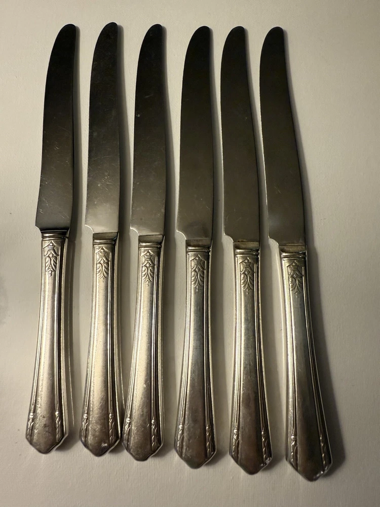 Elevate your dining experience with the WM Rogers Silver Plate Set of 6 Dinner Knives, a testament to classic elegance and craftsmanship. Each knife in this set boasts the fine attention to detail and superior quality that is synonymous with the WM ROGERS and son brand, known for their exceptional silverplate tableware. This set of antique silver plated flatware is a striking addition to any table setting, perfect for those who appreciate the beauty and heritage of silverware. The sophisticated design and durable composition ensure these knives are not only a visual delight but also a practical choice for daily use or special occasions.