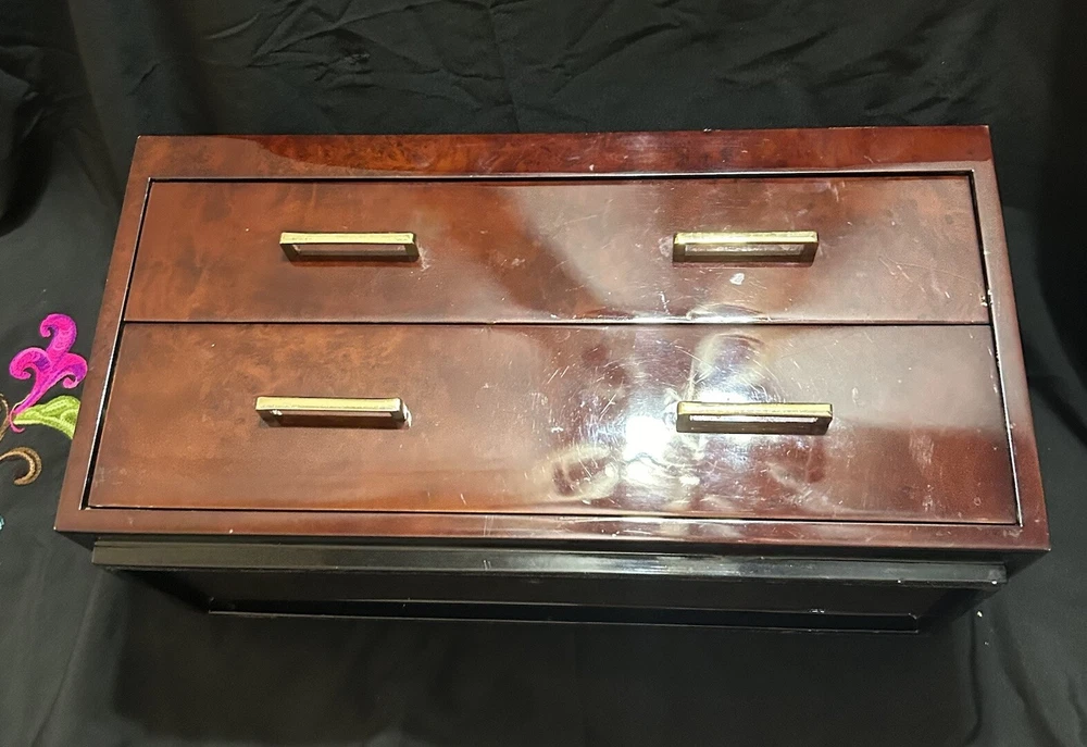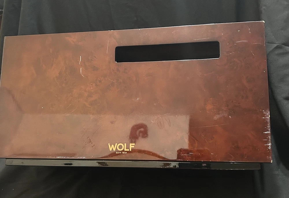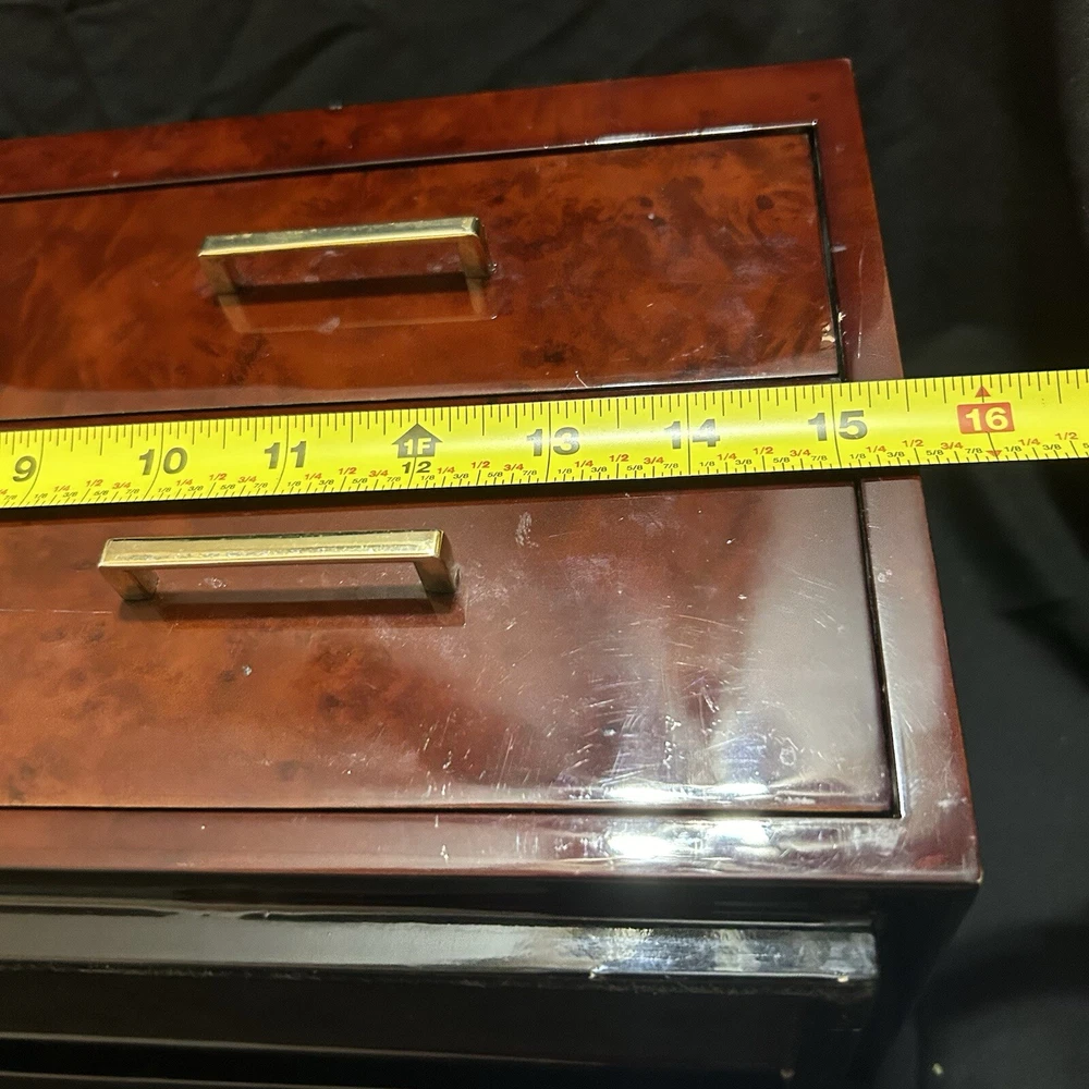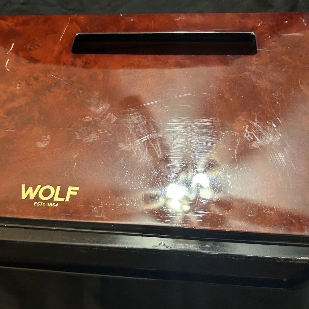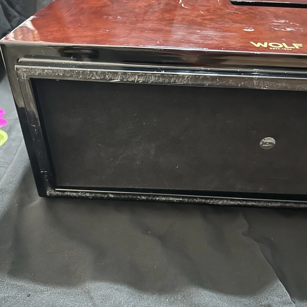 WOLF Meridian 2 Drawer Valet with Charging Station & Pen Box 15in Reddish Brown 15 x 8 x 6 The charging station is a hole in the back through where you can set your phone to charge. You will be receiving exactly what you see in pictures Good used condition. There are several little imperfections from use and aging such as scratches and some small chips. One of the compartments’ dividers is loose but it works perfectly. Please study pictures carefully before purchasing. Feel free to ask us any questions. Thank you for visiting our store!