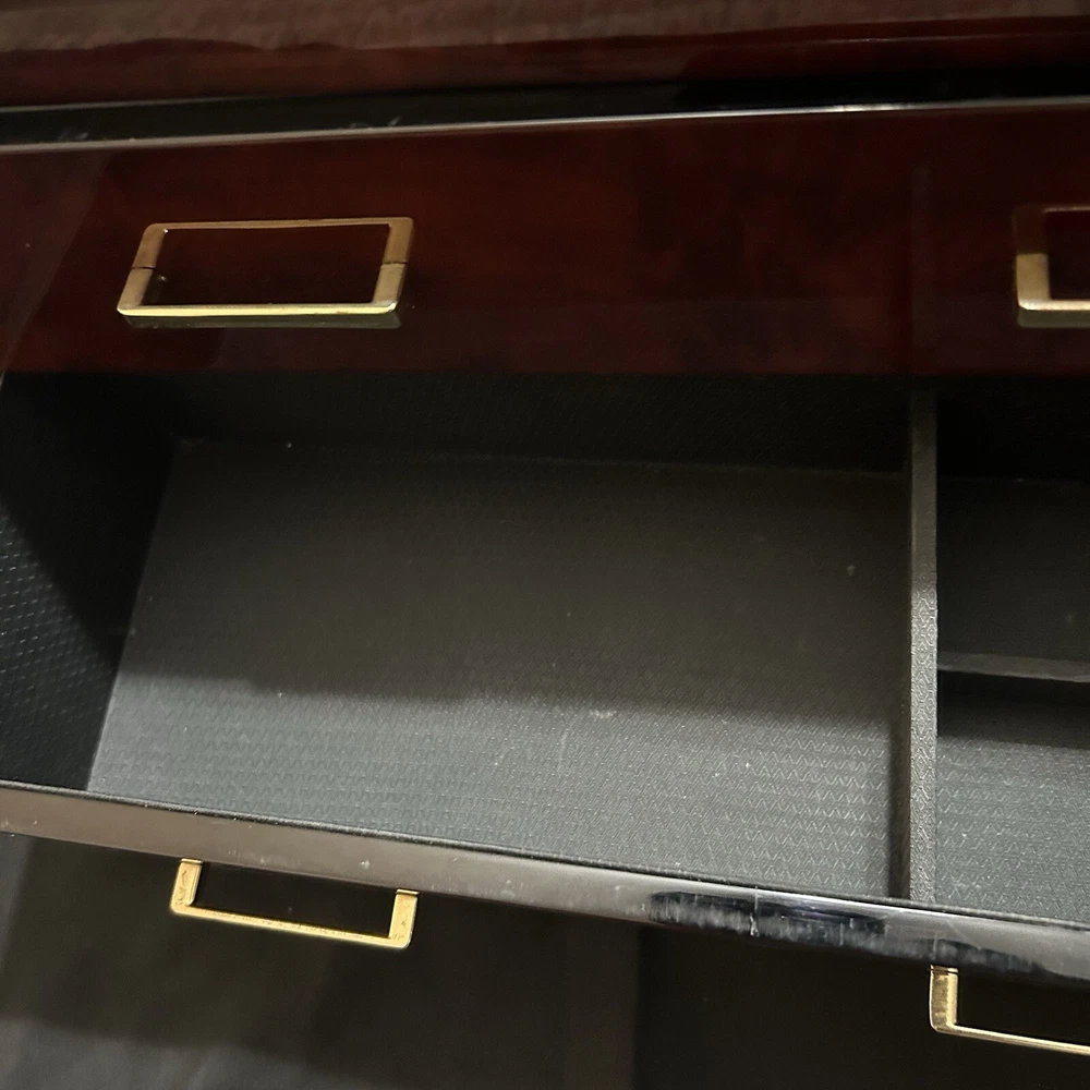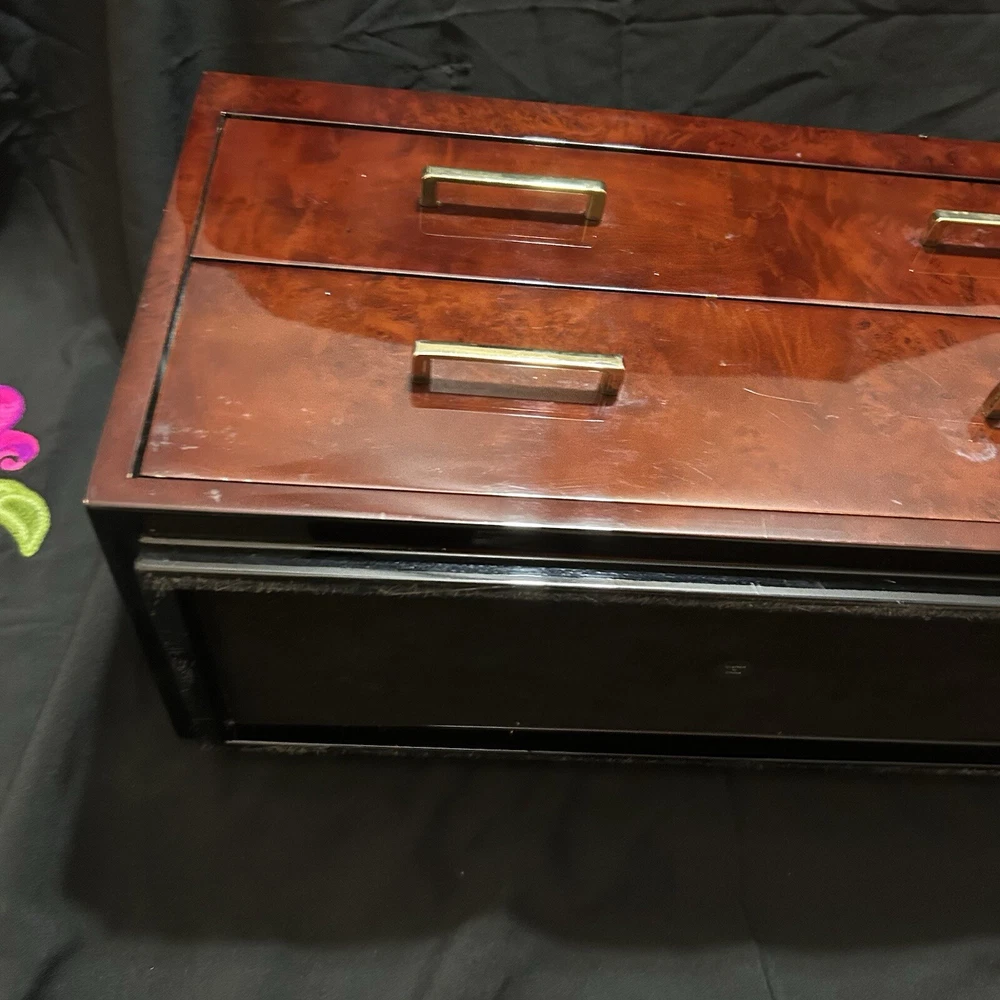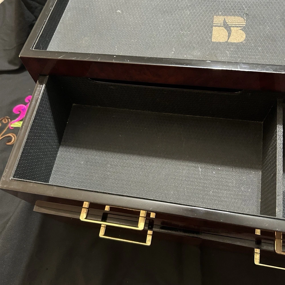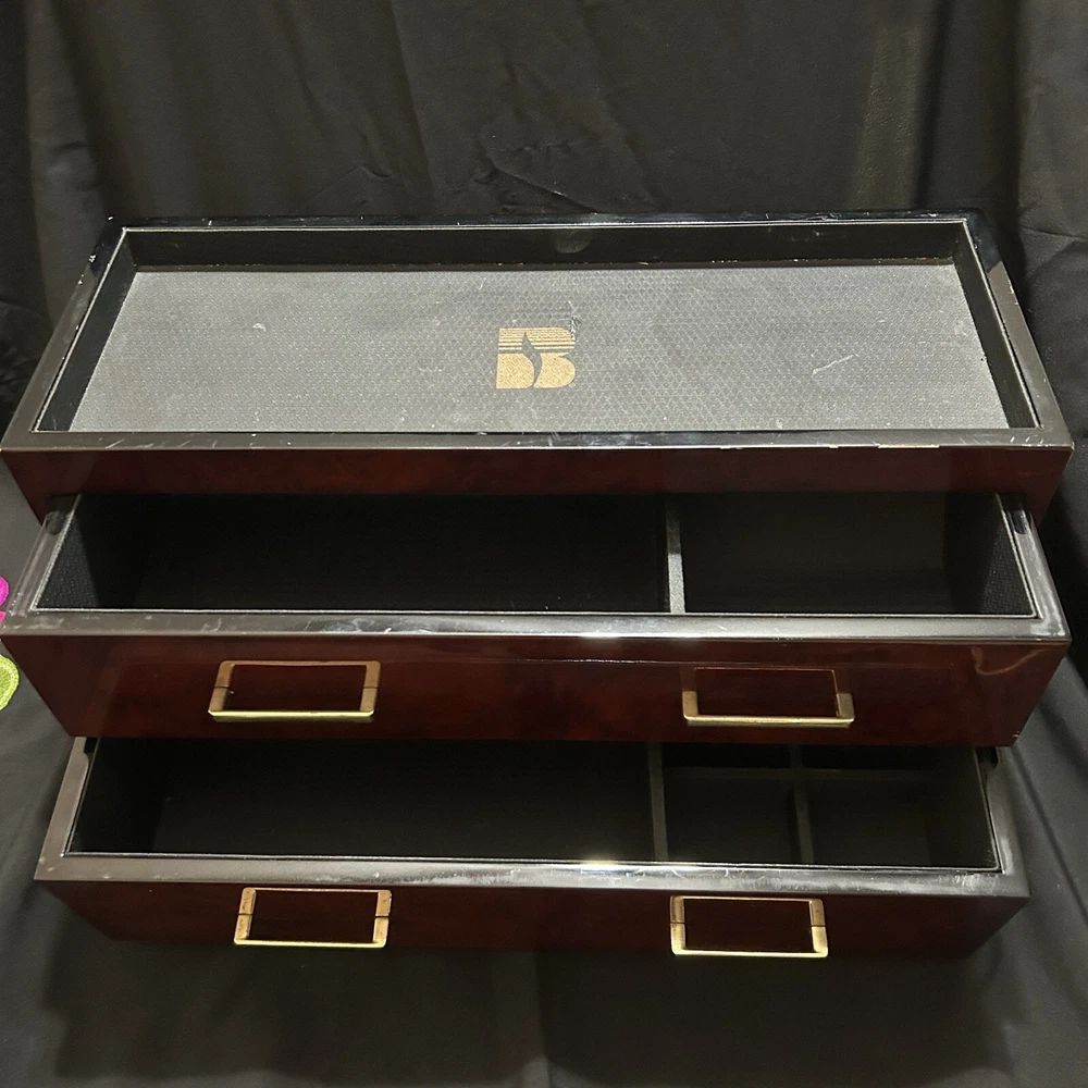 WOLF Meridian 2 Drawer Valet with Charging Station & Pen Box 15in Reddish Brown 15 x 8 x 6 The charging station is a hole in the back through where you can set your phone to charge. You will be receiving exactly what you see in pictures Good used condition. There are several little imperfections from use and aging such as scratches and some small chips. One of the compartments’ dividers is loose but it works perfectly. Please study pictures carefully before purchasing. Feel free to ask us any questions. Thank you for visiting our store!