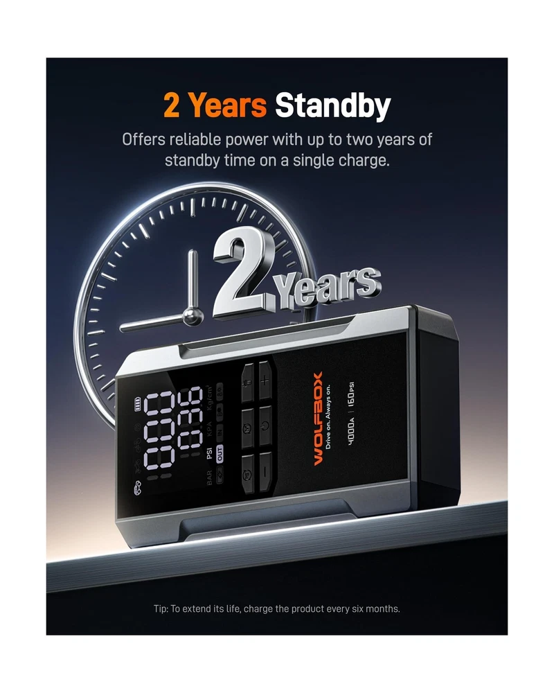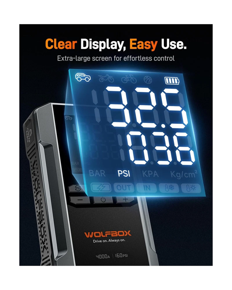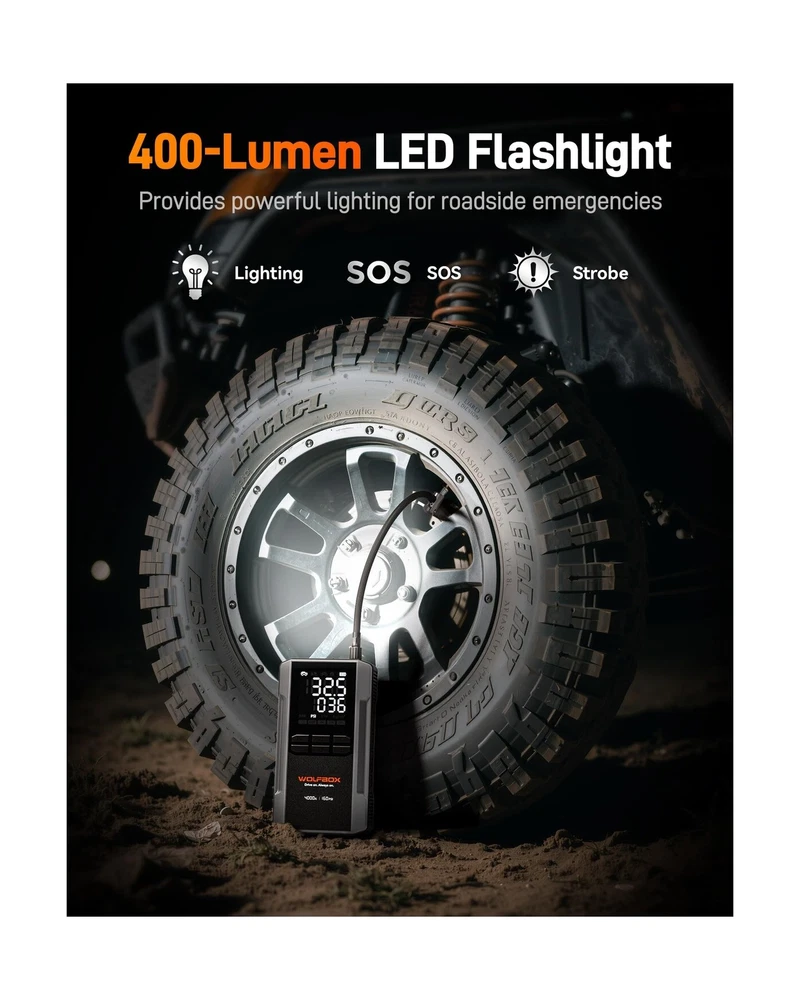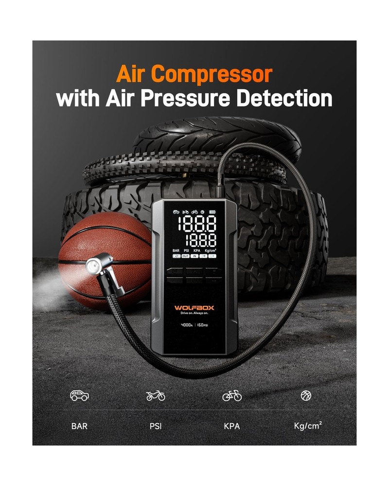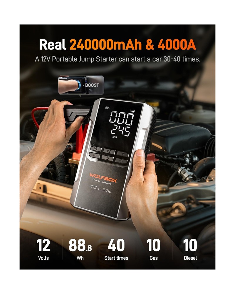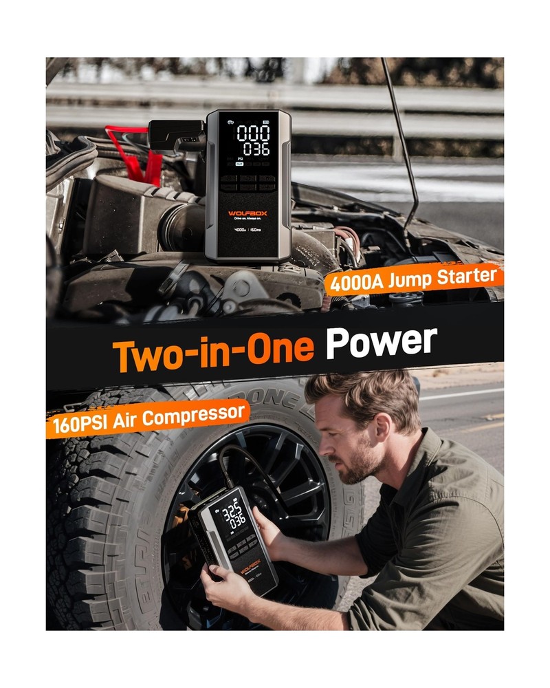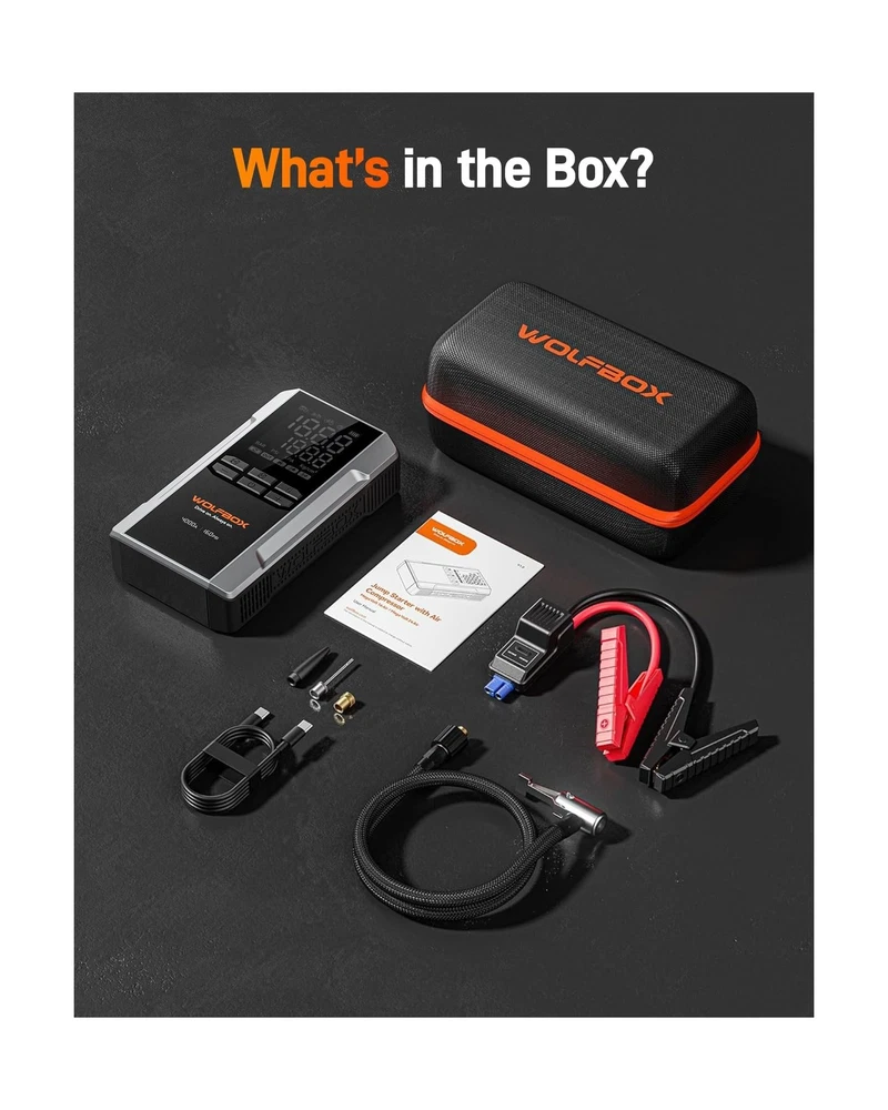 WOLFBOX 4000A Jump Starter with 160PSI Air Compressor, 12V Car Battery Booster, 65W Fast Charge, 24000mAh Portable Tire Inflator, LED Display for 10L Gas & 10L Diesel Engines, LED Light, Jumper Cables Description Features: Newly Upgraded All-in-one Jump Starter and Air Compressor - Built-in 24000 mAh battery and a peak current of 4000A, it can start a completely dead 12V car battery (up to 10L gas or 10L diesel engines). It can also inflate the tires of pickup trucks and below, combining multiple functions in one device 65W Fast Charge - With USB-C 65W port, USB-A ports (12W/18W) and upgraded 160W DC continuous output, it can be fully charged in as fast as two hours. It's also a 24,000 mAh mobile power bank, ready to power tablets, phones and other devices Inflate a Pickup Truck in 2.5 Minutes - With a powerful 45 liter per minute (160 PSI) motor, it takes just 2 minutes 30 seconds to inflate a 315/70 R17 pickup truck tire from 30 PSI to 36 PSI, and 1 minute 20 seconds to inflate a 275/70 R17 SUV tire, making quick work of insufficient tire pressure Booster & 400 Lumen Lights - Offers a powerful booster for starting vehicles in low voltage conditions and is 3-5 times brighter than typical equipment with its 400-lumen LED flashlight. Includes distress, strobe, and high beam modes, making it an essential emergency device Operates down to -4F & 10 Types Protections - The portable battery jump starter with air compressor, rated at IP64 for protection, ensures resilience in harsh environments. Operates at -4F and survives the cold Product Details: Brand: WOLFBOX Product Dimensions: 2.17"D x 5.28"W x 9.37"H Item Weight: 5.3 Pounds Amperage: 600 Milliamps Peak Output Current: 4000 Amps Brand: WOLFBOX Product Dimensions: 2.17"D x 5.28"W x 9.37"H Item Weight: 5.3 Pounds Amperage: 600 Milliamps Peak Output Current: 4000 Amps Manufacturer: WOLFBOX Automotive Fit Type: Universal Fit Model: MegaVolt24 Air Item Weight: 5.3 pounds Item model number: megavolt 24 air Batteries: 1 Lithium Ion batteries required. (included) Manufacturer Part Number: MegaVolt 24 Air Date First Available: February 11, 2025 Delivery We Do Not Ship Outside of the Continental US. Return Policy All items qualify for returns within 30 days of receipt. Buyer is responsible for return shipping on any item that is not damaged. Feedback We take our reputation seriously, we buy and sell online, so we understand the value of trust. If you are unsatisfied with your order, please contact us and we will work with you to resolve it to your satisfaction.