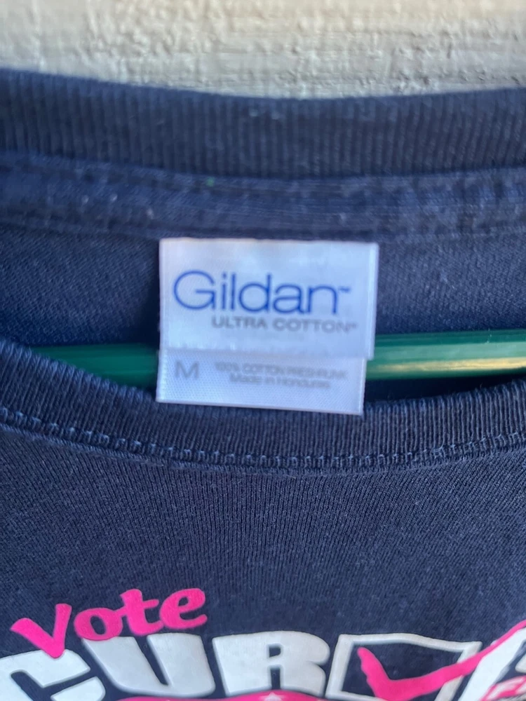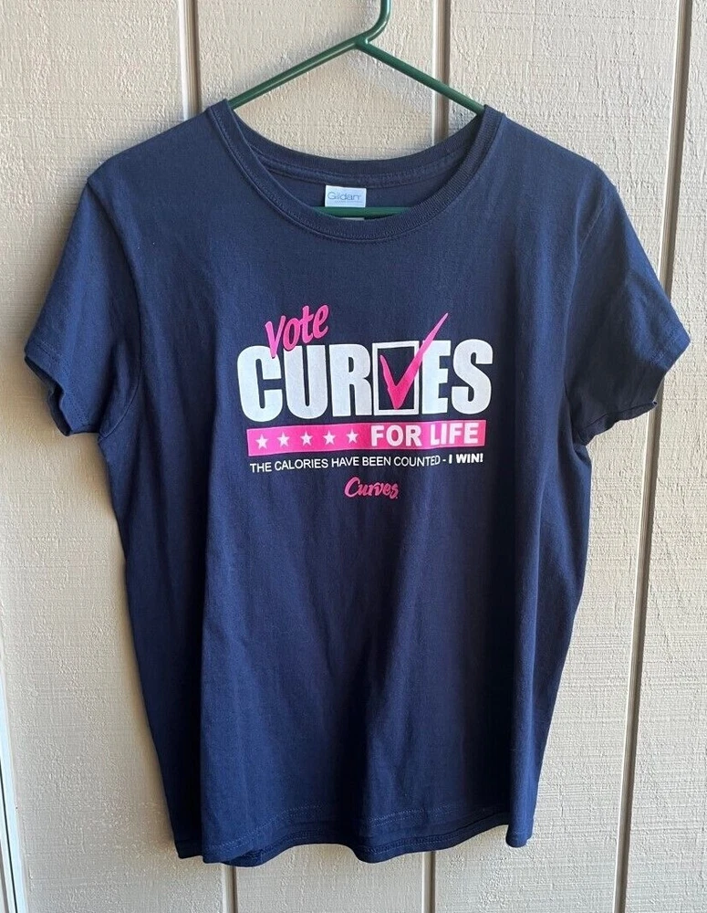 A BRAND NEW CURVES GILDAN ULTRA COTTON T-SHIRT IN A SIZE MEDIUM. NAVY T-SHIRT WITH PINK & WHITE GRAPHIC - "VOTE CURVES FOR LIFE, THE CALORIES HAVE BEEN COUNTED - I WIN, CURVES". ROUND NECK - SHORT SLEEVES. MEASURES APPROX. 25 1/2" FROM SHOULDER SEAM TO BOTTOM OF HEM AND 20" FROM UNDERARM SEAM TO UNDERARM SEAM. FROM A SMOKE FREE HOME. (HANGER NOT INCLUDED)