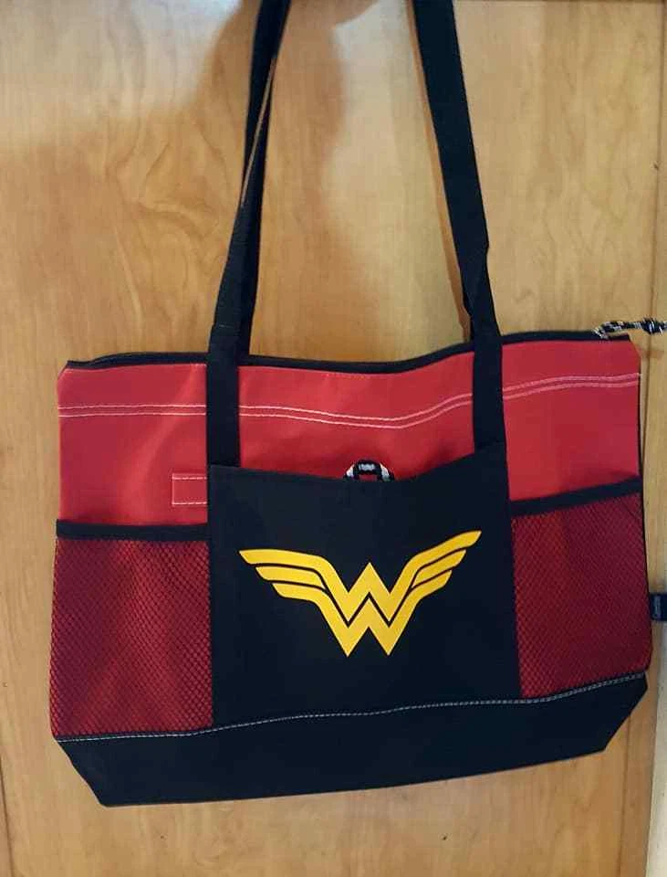 WONDER WOMAN ZIPPERED GEMLINE TOTE YOUR CHOICE OF COLOR TOTE COLOR GEMLINE BRAND TOTE - VERY NICE AND DURABLE GREAT TO USE FOR OVERNIGHT BAGS, PURSES, TRIPS TO THE LAKE OR BEACH, CAMPING, USE AS A DIAPER BAG AND SO MUCH MORE THE DESIGN IS HEAT PRESSED VINYL AND WILL BE DONE IN YELLOW BAG SPECS: 600-denier polyester 29½" Black webbing shoulder straps Zippered main compartment Front pocket with pen loop Two side mesh pockets Back panel is Black 20"W x 14"H x 4"D If you have a design request feel free to send us a message. We will work to see what we can do for you. Thanks! We try to ship out our items as quick as possible, but with made to order items it could take up to 5 days for the item to be completed and shipped. We thank you for your patience. DESIGN MAY BE SLIGHTLY ENLARGED TO SHOW DETAIL. DESIGNS WILL NOT EXCEED 6.5 INCHES EITHER IN WIDTH OR LENGTH. Be sure to fully examine all pictures closely and read auction completely prior to placing a bid. If you have any questions please be sure to contact me and I will do my best to answers them. I do combine shipping! Please note that our post office is closed on Sat & Sun so we can only ship Mon-Fri. Paypal is the only form of payment we accept at this time. If ever there is a problem please contact us prior to leaving bad feedback. We strive for a 5 star rating. Thank You :-) We sell a large variety of items. Be sure to stop in our store to see the other wonderful items we have to offer. From new to used to custom made. We do combine shipping!