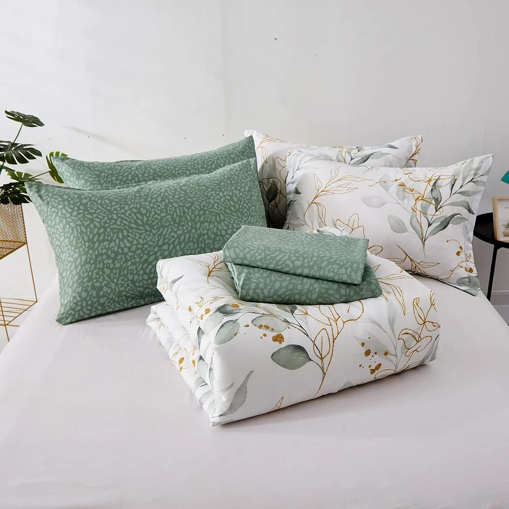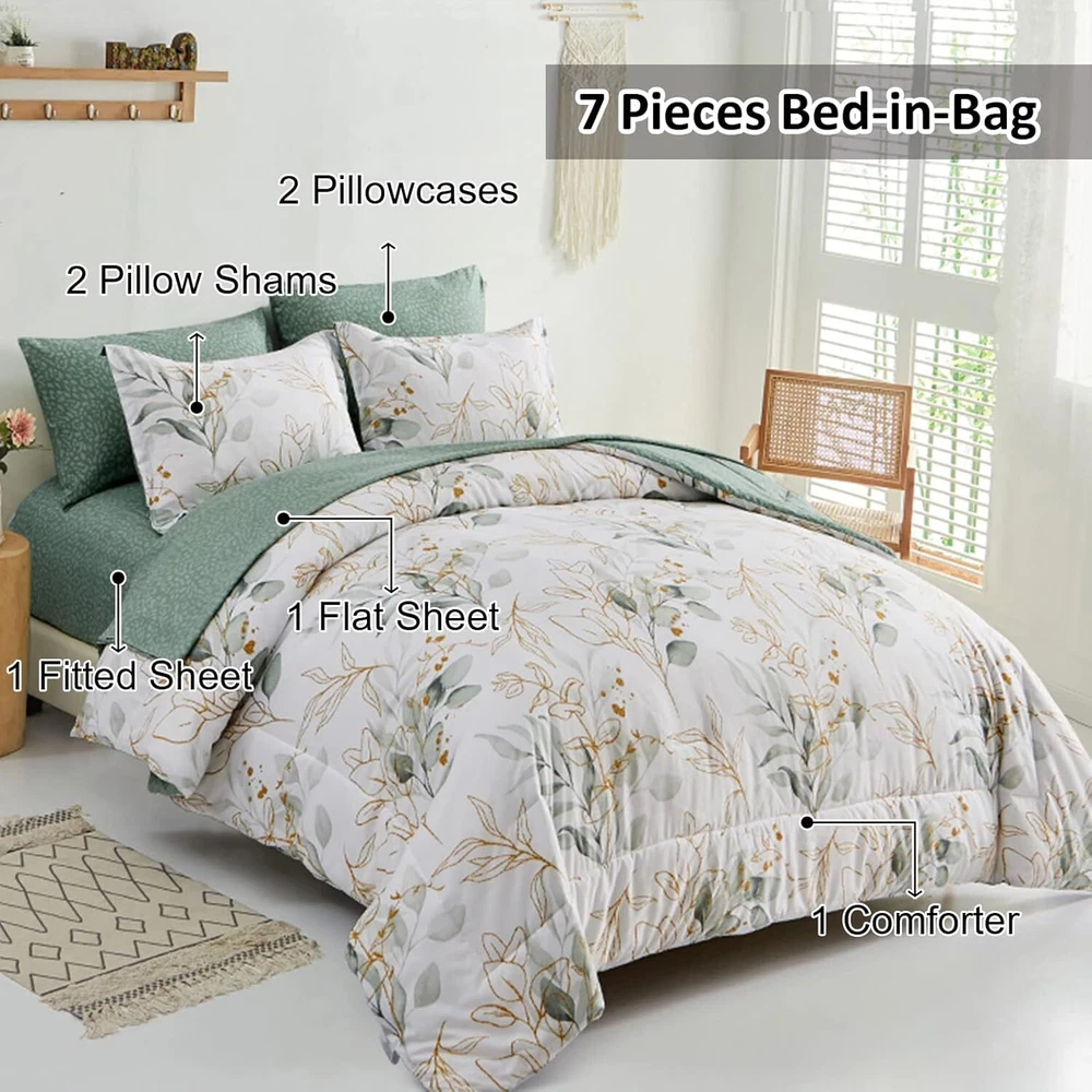 【7 PIECES BED IN A BAG】: This botanical bed in a bag Comforter Set full include 7 pieces. 1 comforter 78"x90" + 2 pillowcases 26" x 30"+1 Fitted Sheet 60"x 75"+14"+1 Flat Sheet 81"x 96"+2 Pillow Shams 20"x 26".NOTE: No Pillow Insert Includes. 【BOTANOCAL REVERSIBLE PATTERN】:This comforter set full adopts a reversible design.A side is green and gold leaf looking beautiful color give your bedroom a bright and lively atmosphere, suitable for people of all ages. B side is a fresh and trendy forest green. Soft color combinations to make your bed look more luxurious. 【ULTRA SOFT MICROFIBER MATERIAL】:This botanical comforter set used the whole piece of polyester as the filling of the comforter which makes the comforter more soft and warm.It is more comfortable and breathable to use, skin-friendly, smooth to the touch, and fade-resistant. High density stitches make sure to avoid the comforter to shifting and clumping 【EASY TO CARE】:This 7 pieces bed in a bag polyester microfiber high quality fabric, easy care, low temperature machine wash, never fade, wrinkle free, dustproof, easy to remove pet's fur. Our comforter set can be used directly without a quilt cover, which is more convenient to use. 【WARM TIPS】:As the comforter set is packed in vacuum bags, it is recommended that you dry the comforter set in the sun and gently tap the quilt to make it fluffy again.