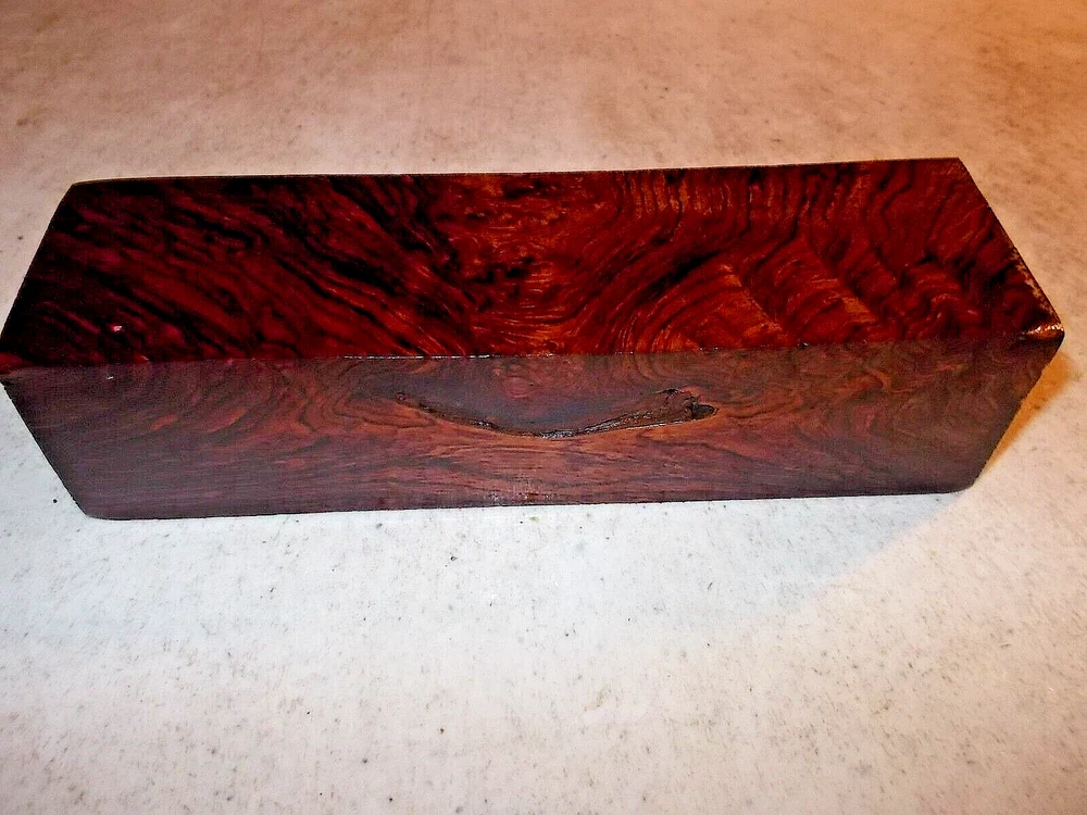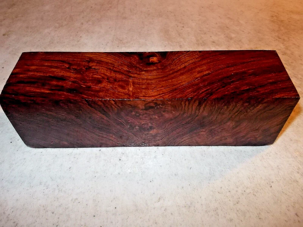 .This Honduran rosewood burl block is perfect for making gun grips, knife scales, and box tops. The rich, deep color and intricate grain pattern make it a stunning choice for any woodworking or crafting project. Harvested from Honduras, this rosewood is known for its durability and strength, making it a reliable choice for high-use items. The cutlery blanks aspect allows for endless creative possibilities, and the model aspect specifically refers to the type of wood used. In addition to gun grips and knife scales, this block can also be used for turning blanks, adding to its versatility. Perfect for both novice and experienced woodworkers, this Honduran rosewood burl block is a must-have for any crafting, collecting or woodworking project. SIZE= 1 1/4" x 1 1/2" x 5 1/8"