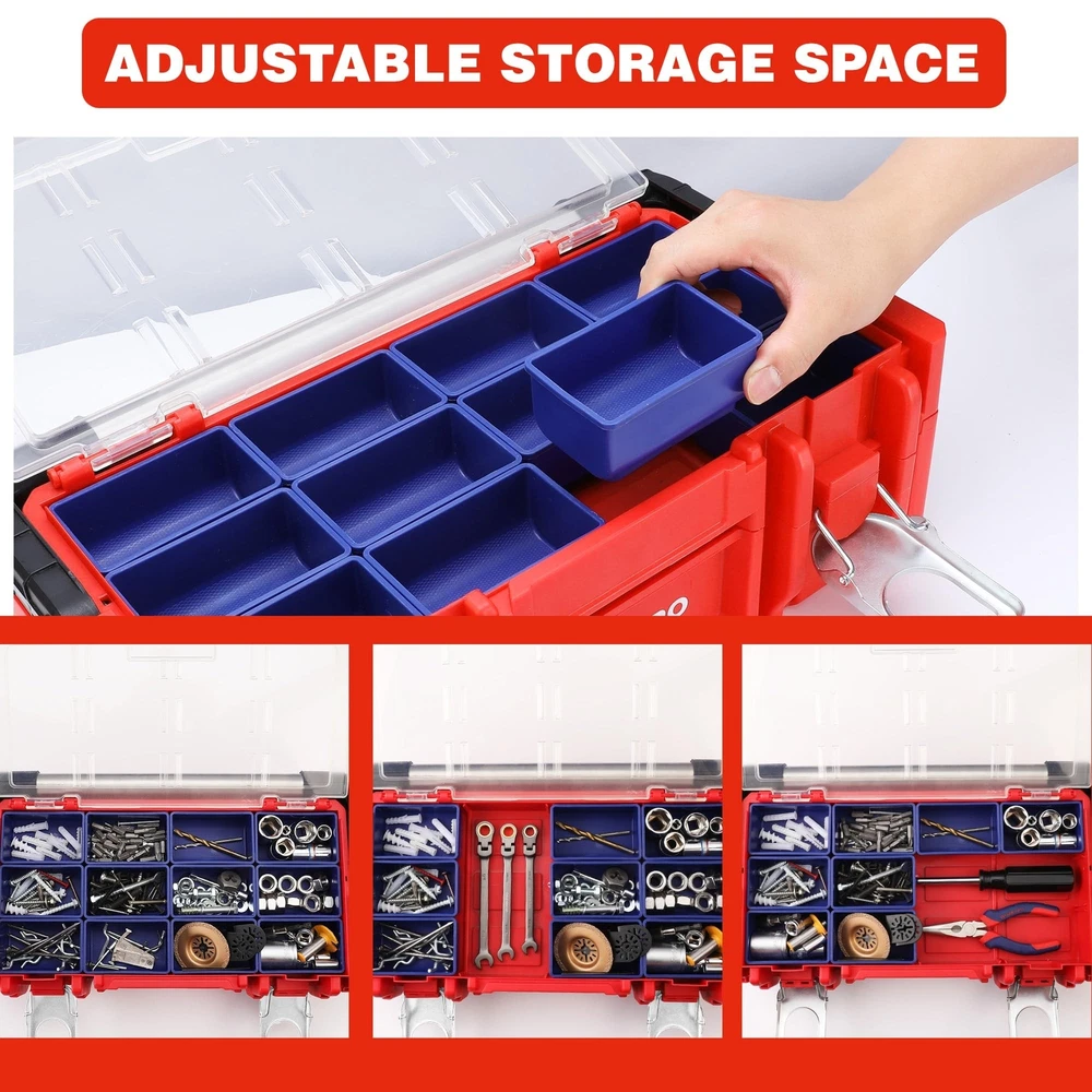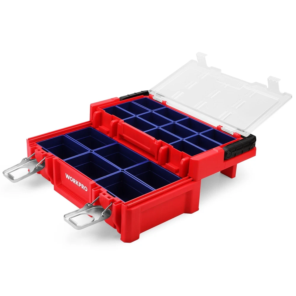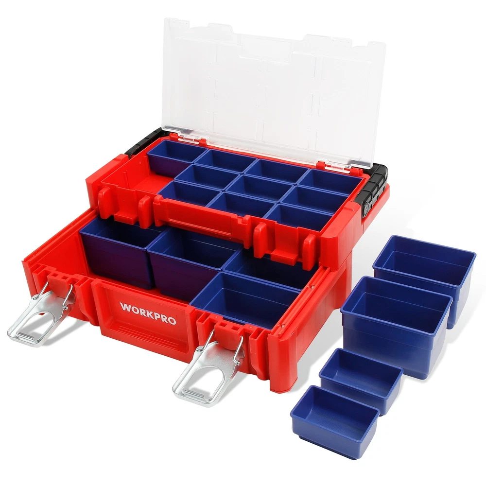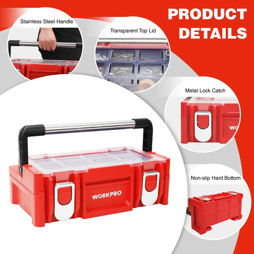 WORKPRO 17-inch Plastic Tool Box, Red Storage Box with Locking Lid and Stainless Steel Handle, 18 Adjustable Compartments for Sockets, Crafts and Power Tools, Great Father Day Gifts Product Details Brand: WORKPRO Material: Stainless Steel, Plastic Color: Red Product Dimensions: 17"L x 5"W x 9"H Water Resistance Level: Water Repellent Brand: WORKPRO Material: Stainless Steel, Plastic Color: Red Product Dimensions: 17"L x 5"W x 9"H Water Resistance Level: Water Repellent Maximum Weight Recommendation: 80 Kilograms Number of Compartments: 18 UPC: 820909758877 Global Trade Identification Number: 77 Manufacturer: HANGZHOU GREATSTAR INDUSTRIAL CO.,LTD Item Weight: 5.66 pounds Item Package Quantity: 1 Batteries Included?: No Batteries Required?: No Date First Available: November 20, 2019 Movable Box with Lid: The tool box contains 18 movable compartments with a transparent cover. All compartments are easily put in and out to customize the storage case. The transparent lid allows you to see everything at a glance Metal Lock Catch & Handle: The Lock catch is solid and firm to provide safety, while the widened handle provides convenient and portability Sliding Layer with Support: The special sliding design provides as much access space as possible. It is more convenient to select parts Durable Material with Stiffener: The box is made of PP material with a widened stainless steel handle. The stiffener structure ensures the throw resistance and load-bearing Dimensions & Function: The tool box dimensions: 17" x 9-1/2" x 5-5/8". It is perfect for sockets, bits and other accessories storage