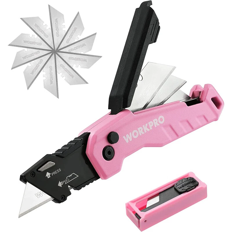 Description High Quality: The blade material is high-strength stainless steel SK5. The blade can stay sharp for a long time without bending. It can cut paper, rope, leather, soft plastic, water pipes, etc. Aluminum die-cast molding makes its blue handle more durable. The non-slip handle is ergonomic and comfortable to use. Quick Blade Change: Simply press the release button to remove the blade and insert a new one. Change blade quickly and safely without any tools. Blade Storage: It includes 13 SK5 blades. The handle can store 3 blades. The red and blue blade case contains 10 trapezoidal SK5 blades. Push-button design, push one blade at a time until it uses out. Portable and Lightweight: The folded size is only 4.5 inches. And the weight is only 5 ounces. The back clip feature makes it easy to carry belts, pockets, and bags. Ideal Gift: The blue utility knife can be kept as a tool in your garage, tool kit, home, and office. The blue folding knife is perfect as a gift for Father's Day and Valentine's Day. Pink Ribbon: WORKPRO Tool is donating $0.1 from this purchase to the NATIONAL BREAST CANCER FOUNDATION, INC. NBCF is Helping women by providing early detection, education, and support services to those affected by breast cancer. Manufacturer HANGZHOU GREATSTAR INDUSTRIAL CO.,LTD Part Number W011047AB/W011048AB/W011049AB Item Weight 7.7 ounces Package Dimensions 5.63 x 2.87 x 1.34 inches Item model number W011047AB/W011048AB/W011049AB Color Red/Blue/Pink Material Stainless Steel Handle Material Aluminum Special Features Lightweight, Foldable Blade Storage in Handle The handle can store 3 blades. Push Button Design The push-button is designed for easy access to the blade. Push one blade at a time until it uses out. SK5 Sharp Blade Steel construction Compatible with most standard utility knives WIDELY USE For Cutting the Leather For Cutting Bubble Bags For Cutting the Carton