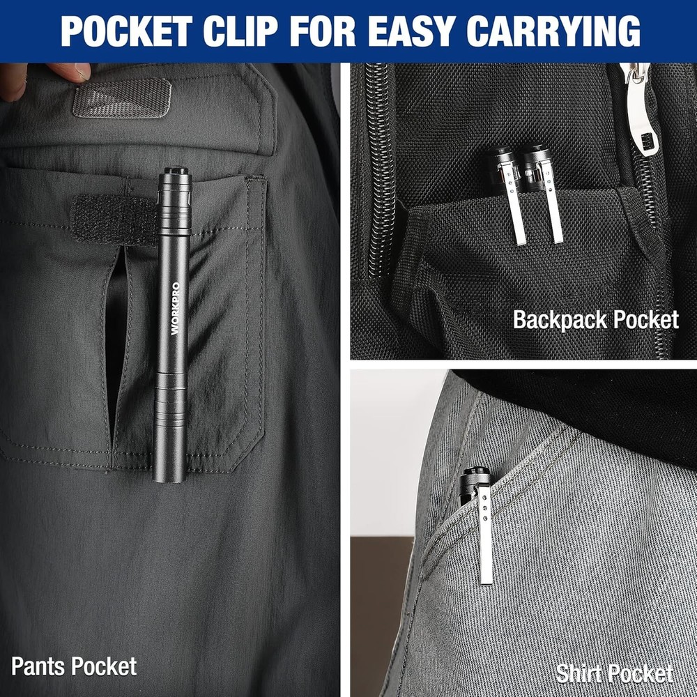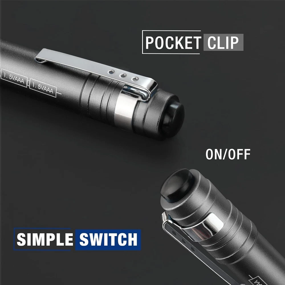 Durable Aluminum Construction: Made from anodized machined aviation aluminum, this 4-pack of pen flashlights boasts a durable design resistant to wear, drops, and bumps. Bright LED Illumination: Each flashlight is equipped with a super-bright LED that provides up to 2 hours of runtime on two included AAA alkaline batteries. Compact and Portable: Weighing just 30g (1.05 oz) each, these lightweight flashlights can easily fit in pockets or bags for convenient carry. Convenient Features: The rubber switch prevents accidental activation, while the metal clip allows hands-free use by attaching to belts, pockets, or notebooks.