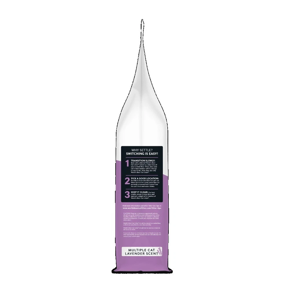 World’s Best Cat Litter® Multiple Cat Lavender Scent formula – the perfect choice for those who prefer a fresh scent in their litter. Made from whole-kernel corn, this formula is similar to the Multiple Cat Unscented formula but includes a natural lavender oil blend for a pleasant fragrance. All World’s Best Cat Litter® formulas are crafted from natural, renewable ingredients, free from harmful chemicals, synthetic perfumes, or clays. Our advanced, patented process harnesses the natural absorbency of renewable ingredients, ensuring our litter is pet-, people-, and planet-friendly. The lavender fragrance is derived from plant-based oil and contains no synthetic ingredients, providing a fresh scent without harming your pets. If your pet shows any adverse reactions or begins to eat the litter, discontinue use immediately. The fragrance may dissipate over time, but the litter will continue to perform effectively. Store unused portions in a cool, dry place, sealed in the bag or bin. All World’s Best Cat Litter® formulas are rigorously tested to be sewer- and septic-safe, allowing you to scoop, flush, and move on with your day. Choose Multiple Cat Lavender Scent formula for a naturally fresh, effective, and sustainable litter solution. NEW LOOK, SAME FORMULA: Our bag’s getting a makeover, but our purrfect litter stays unchanged! The same formula, the same litter and the same great clump. New look coming soon. OUTSTANDING ODOR CONTROL — More cats shouldn’t mean more smells — keep your cats happy with a natural litter with long-lasting odor control. QUICK CLUMPING & EASY SCOOPING — No more chiseling and scraping thanks to a fast-acting natural litter that leaves less mess in and around your litter box. LIGHTWEIGHT & 99% DUST FREE — Naturally free of silica dust, this lightweight cat litter offers low tracking and less mess — so you and your cat can breathe easy. For the best results, do NOT mix with a non-clumping litter. PET, PEOPLE & PLANET FRIENDLY — A naturally safe litter made from whole-kernel corn that offers no harmful chemicals and no artificial perfumes.
