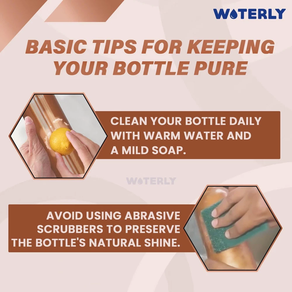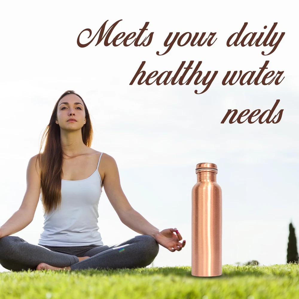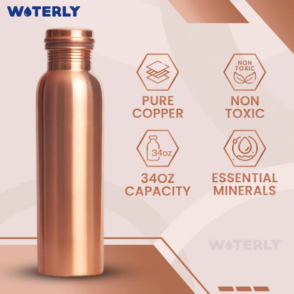 CAPACITY : WOTERLY Copper Water Bottle Having 34 Oz (1000 Ml) Capacity, This Pure Copper Water Bottle Is Perfect For Staying Hydrated During Long Workouts Or Yoga Sessions. It Holds Enough Water To Keep You Refreshed For Hours Without Needing A Refill. BENEFITS OF COPPER : Our copper bottles offers numerous health benefits, such as improved digestion and enhanced immunity. According to Ayurveda, drinking from copper vessels balances the body's and promotes overall wellness. Choose WOTERLY for a healthier lifestyle and a more sustainable planet. 100% Pure Copper Water Bottle : WOTERLY Experience our Pure Copper Bottle, crafted for exceptional health benefits. Embrace Ayurvedic wisdom for overall wellness, combining stylish and functionality in every sip of drinking water START TO ENJOY THE TASTE OF WATER : Discover The Refreshing Taste Of Water With Our Copper Bottle , Infused With Essential Minerals For Natural Health Support. Keep Hydrated All Day With Our Reusable 1-liter Bottle, Ensuring Cold And Delicious Water. Enjoy Pure, Revitalizing Hydration!