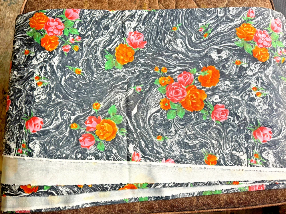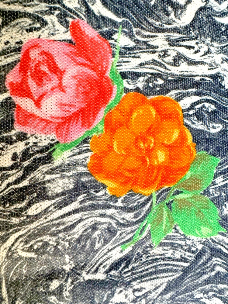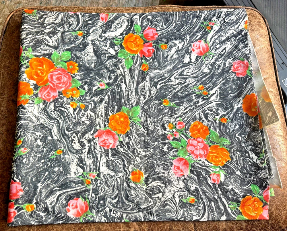 This is for 2 yards of Vintage Polyester Double Knit 62" Fabric. CRAZY Black Marbeling with Pink, Orange, & Green Roses. Unused and carefully stored. Please see pics for condition. No odors. Buyer pays $7.50 s/h. Thanks for looking!