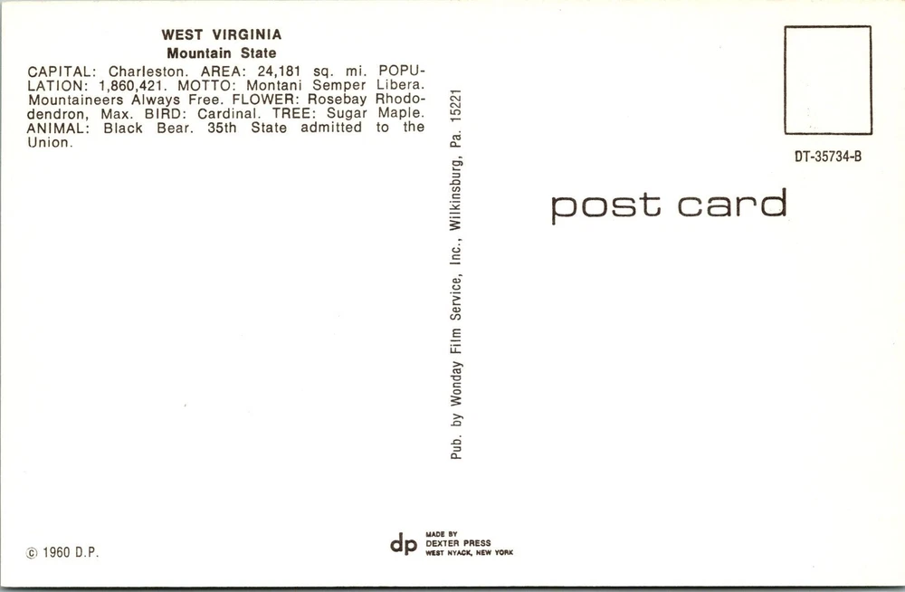 Region: West Virginia Type: Printed (Lithograph) Country: USA Subject: Cities & Towns Postage Condition: See Image Country/Region of Manufacture: Unknown Theme: Cities & Towns City: West Virginia Era: Chrome Unit of Sale: Single Unit Original/Licensed Reprint: Original
