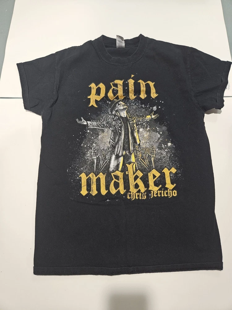 Embrace your passion for wrestling with this sleek black T-shirt, featuring the iconic phrase "PAIN MAKER" in reference to the legendary Chris Jericho. A must-have for any fan of WWE and AEW, this medium-sized shirt is a subtle nod to the sports entertainment world, perfect for casual wear or your next wrestling event. Crafted for comfort and style, the shirt is a versatile addition to any fan's wardrobe, showcasing your allegiance to one of wrestling's most charismatic superstars. Whether you're watching from the ringside or just hanging out with friends, this apparel is an effortless way to connect with the wrestling community.