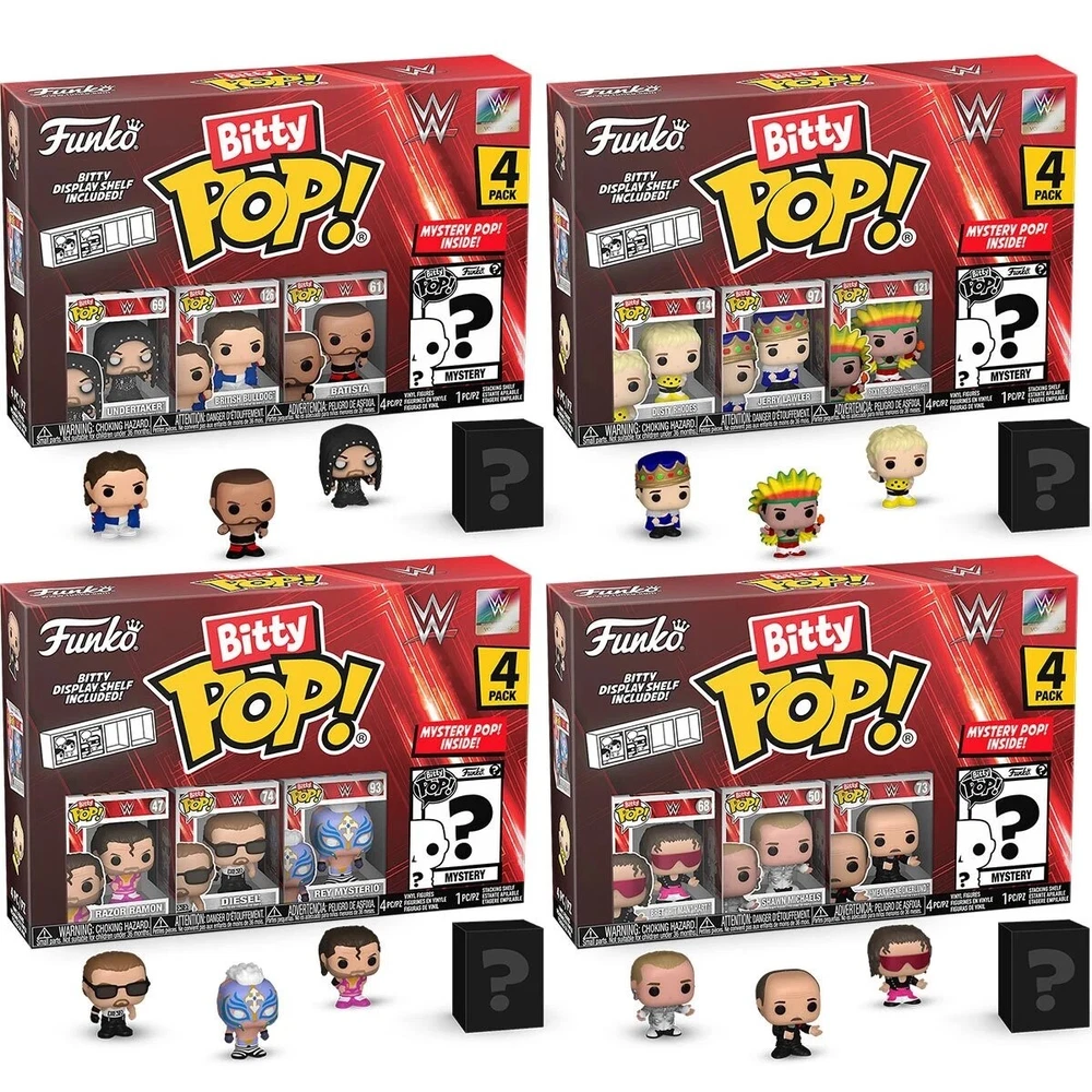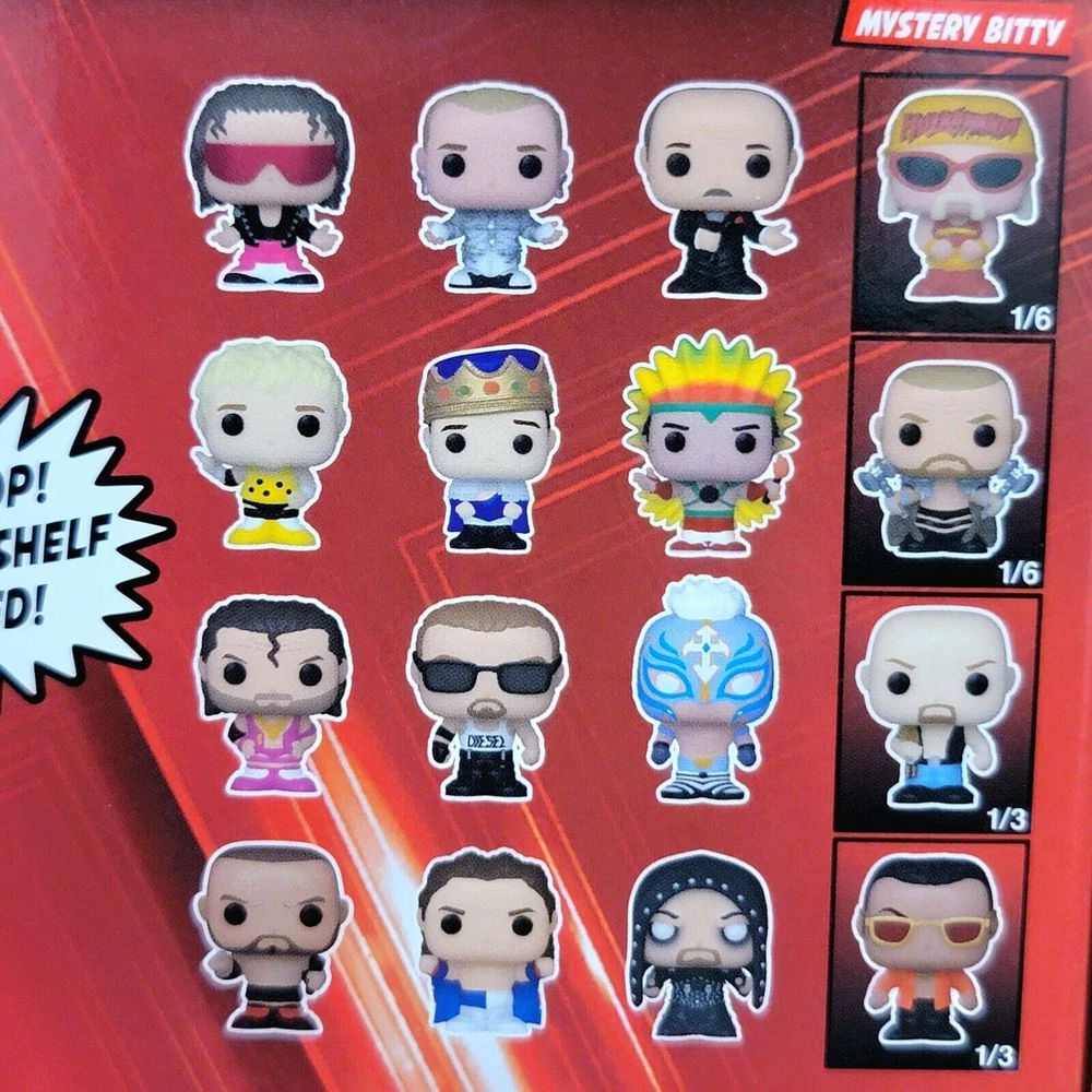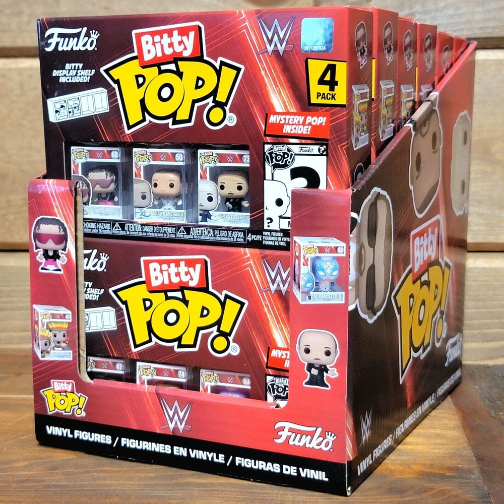 WWE Funko Bitty Pop! Complete Set 4x4 Pack Mini-Figures w/ Mystery Pops Unopened WWE Funko Bitty Pop! Complete Set 4x4 Pack Mini-Figures w/ Mystery Pops Unopened **Read the full description before purchase.** This listing contains multiple of the same item. You will receive the listed figure w/ accessories, brand new, unopened and sealed in its original packaging. The pictures serve as an example only. Condition of the item packaging is not guaranteed to be mint. If you are an "In-Box Collector" message me before purchase to receive the best one available, otherwise you will receive the next in line. You can also leave a note during purchase. All items are securely packaged and shipped regardless of condition. **You can find my Return Policy on the MC Collectible About Us page. Please read if you plan to file a return.** All Action Figures and Funko Pops, sold by MC Collectible, are "IN HAND" and acquired from the Brand Manufacturer, GUARANTEED to be Genuine/Authentic. **Shipping automatically combines when multiple items are added to cart. Some big items may not qualify for combined shipping** * Smoke Free Environment* This WWE Funko Bitty Pop! Mini-Figure 4-Pack Set includes the following: 1x WWE Bret Hart Funko Bitty Pop! Mini-Figure 4-Pack 1x WWE Dusty Rhodes Funko Bitty Pop! Mini-Figure 4-Pack 1x WWE Razor Ramon Funko Bitty Pop! Mini-Figure 4-Pack 1x WWE The Undertaker Funko Bitty Pop! Mini-Figure 4-Pack Running out of space for full-sized Pop! Vinyl Figures? Build a collection of your favorite Pop! Vinyl Figures that take of a fraction of the space! Each Bitty Pop! Mini-Figure measures approximately 1-inch tall and comes packaged in a miniature acrylic Pop! box. The bottom lid of the pop box can be opened to remove the Bitty Pop!, but the figure is attached to the bottom lid. Each Bitty Pop! 4-Pack includes 4x Bitty Pop!s in individual acrylic Pop! boxes, with the set of 4 lined up horizontally together in a long acrylic case. 3 characters are visible, while one is a mystery and could be any one of 4x possible chase figures with varying rarities! Listing and template services provided by inkFrog