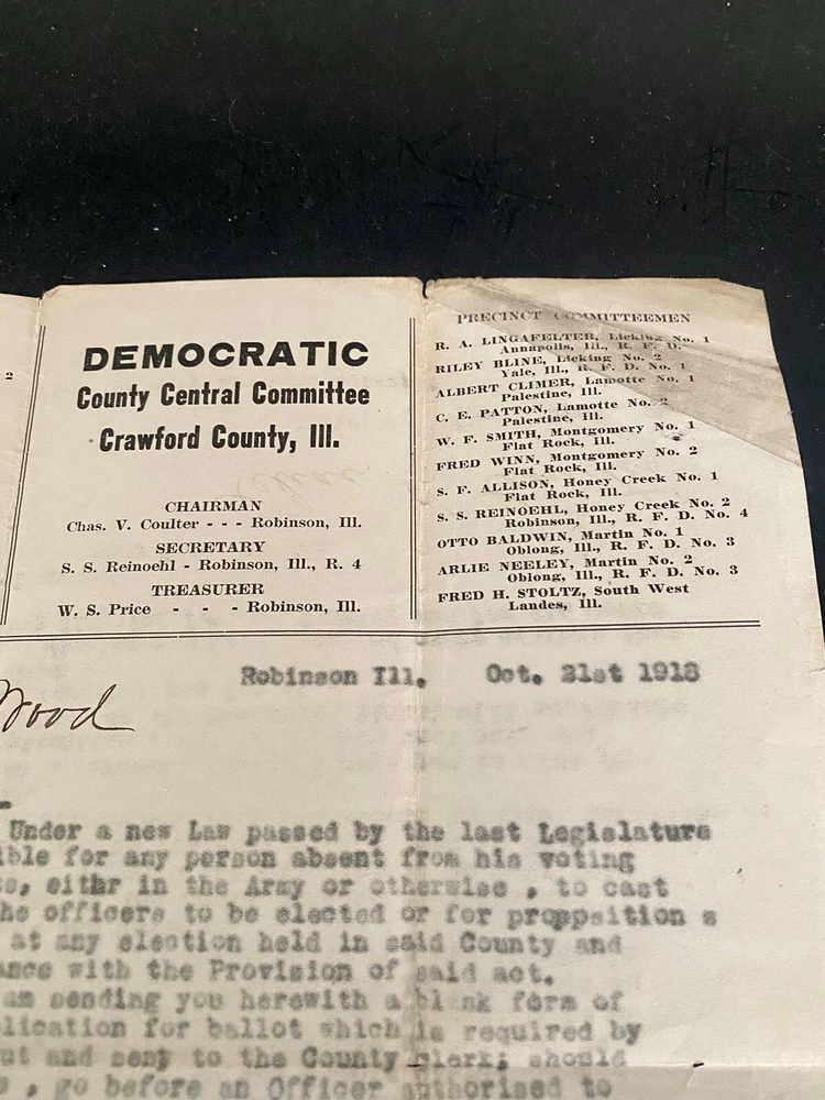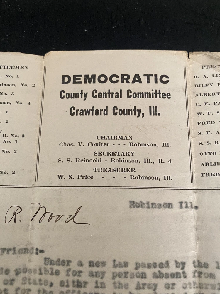WWI LETTER TO SERVICEMAN ASKING FOR HIS VOTE SIGNED DEMOCRATIC COMM. ILLINOIS