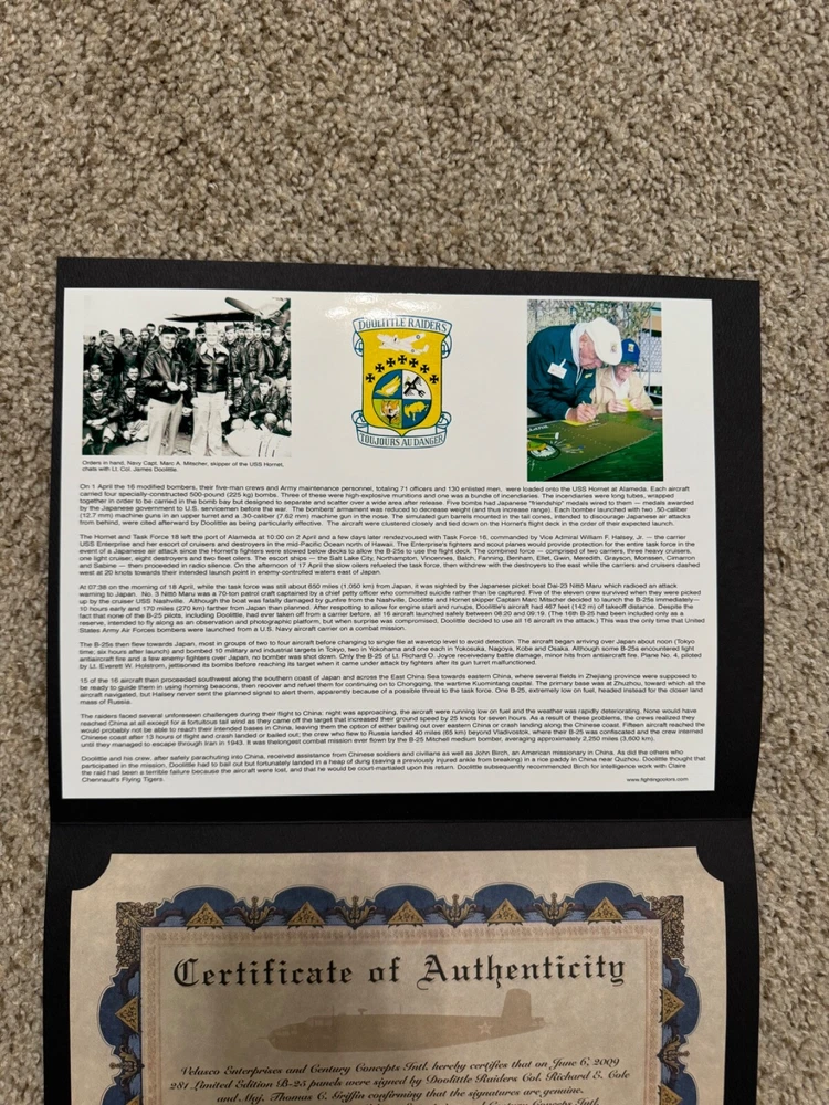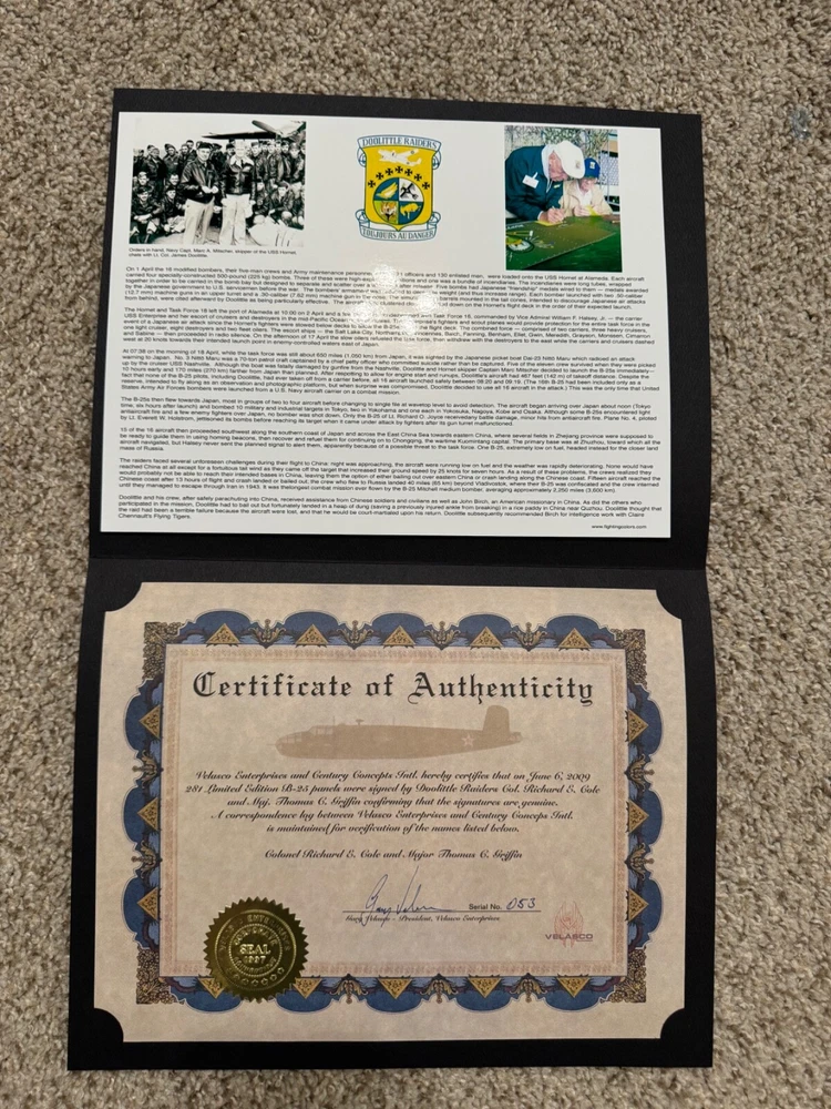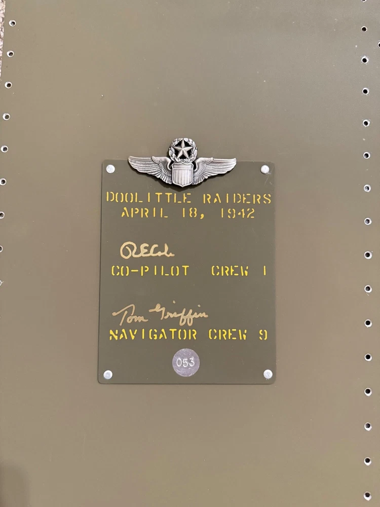 WWII signed Noseart from the remaining crews from the Doolittle Raiders. This limited edition panel measures approximately 2x4ft and is in excellent condition. Signees: Richard Cole, Thomas Griffin All reasonable offers will be considered