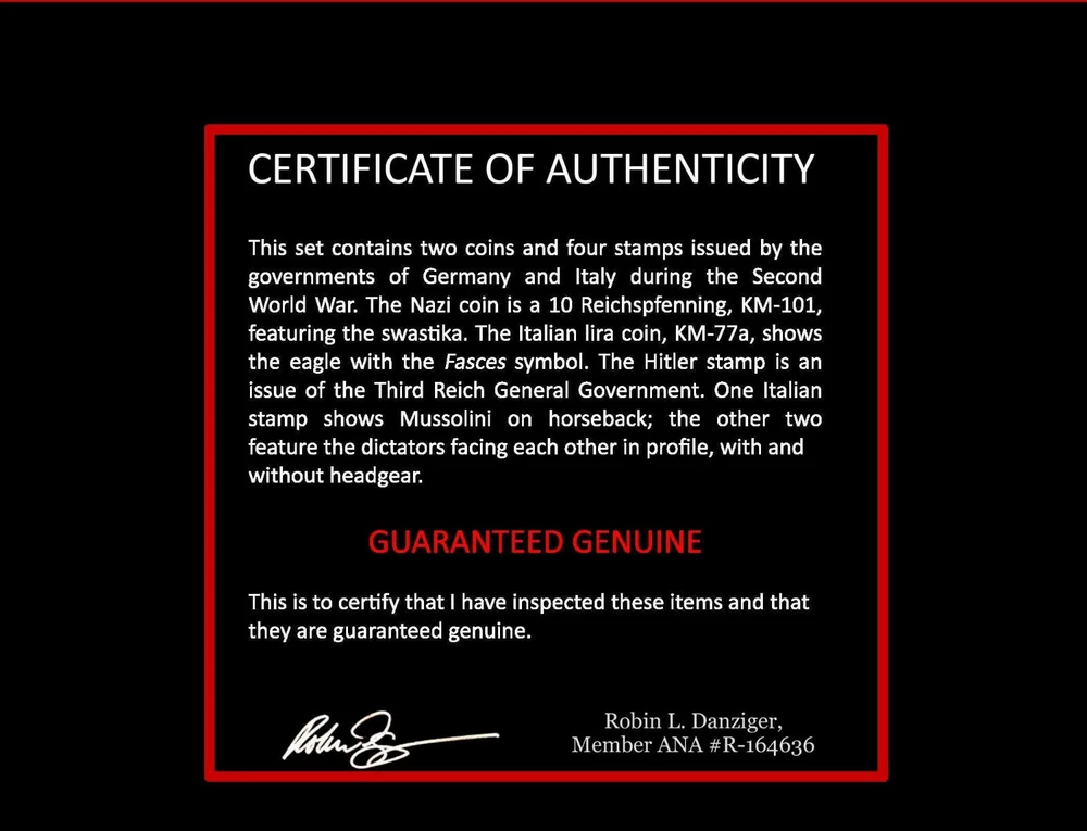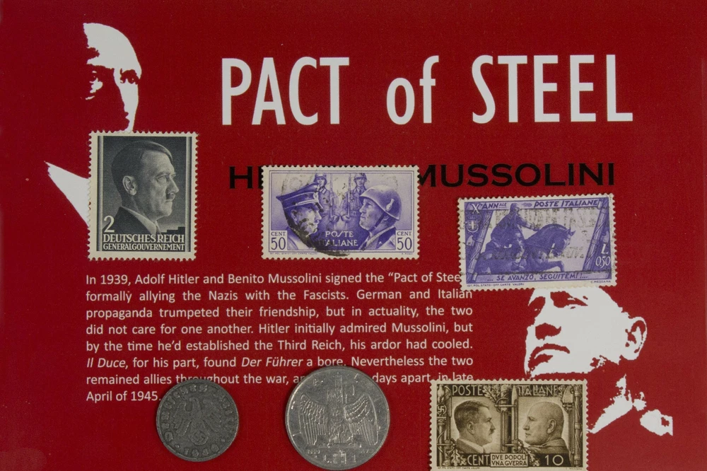 WWII Pact of Steel: Hitler & Mussolini 6-Piece Album 2 Coins 4 Stamps COA Inc. Please see all the pictures for details. Catchy Collections.