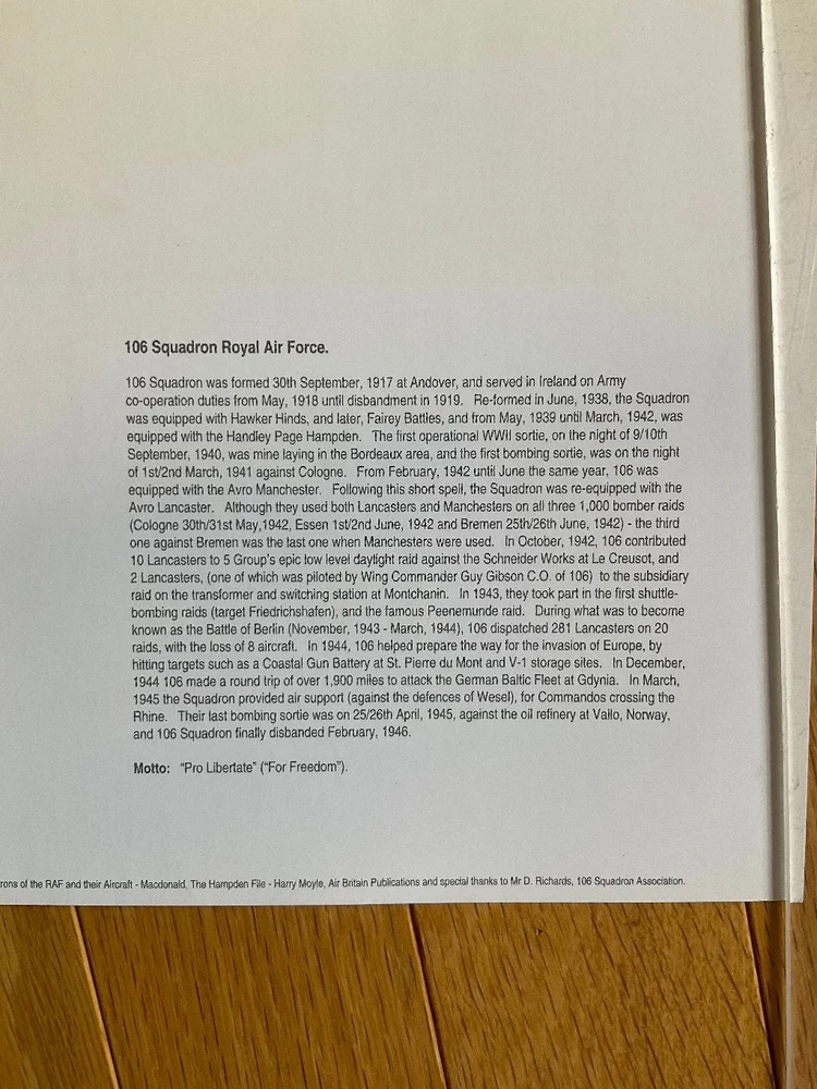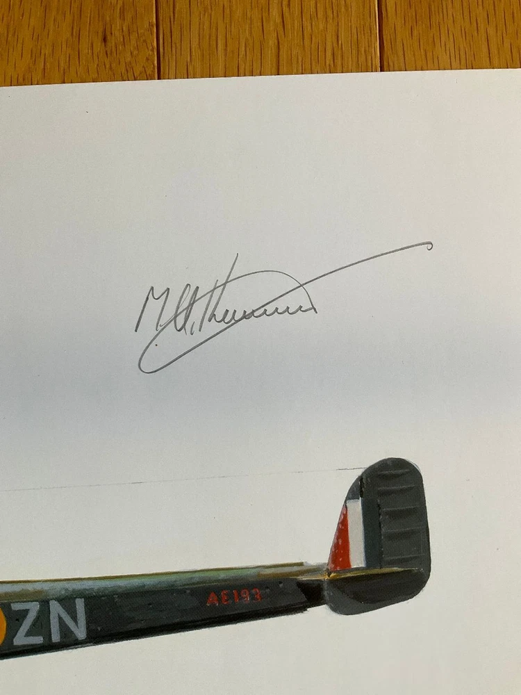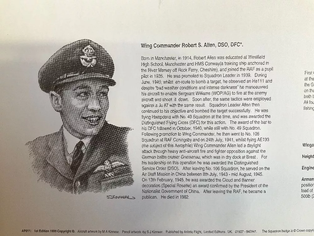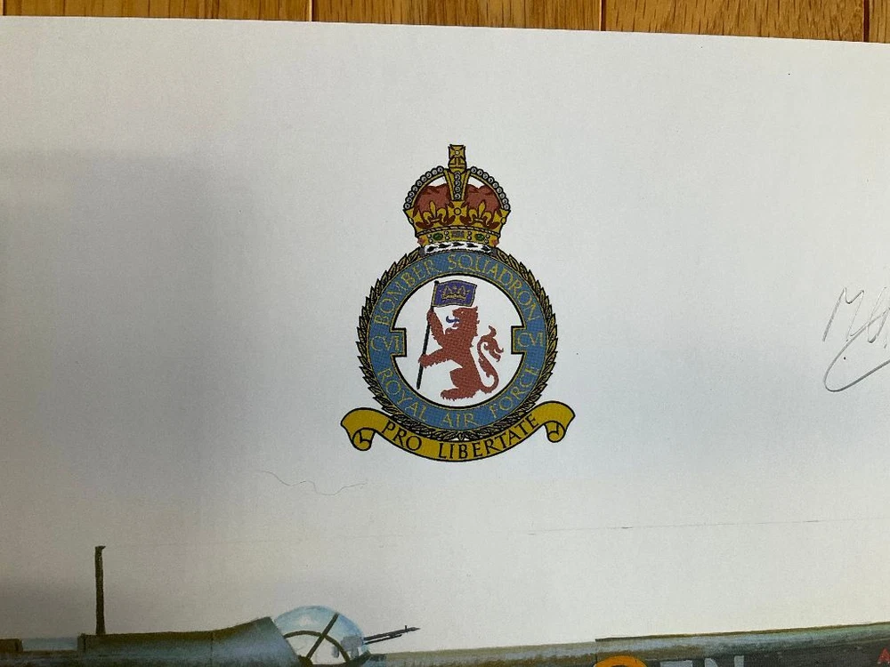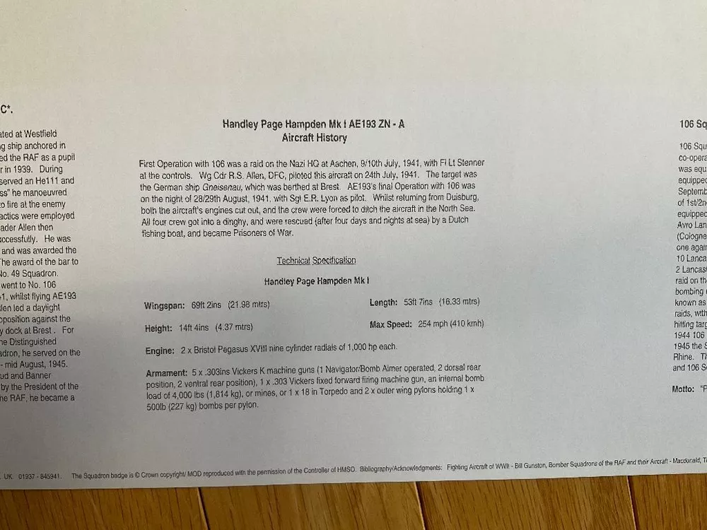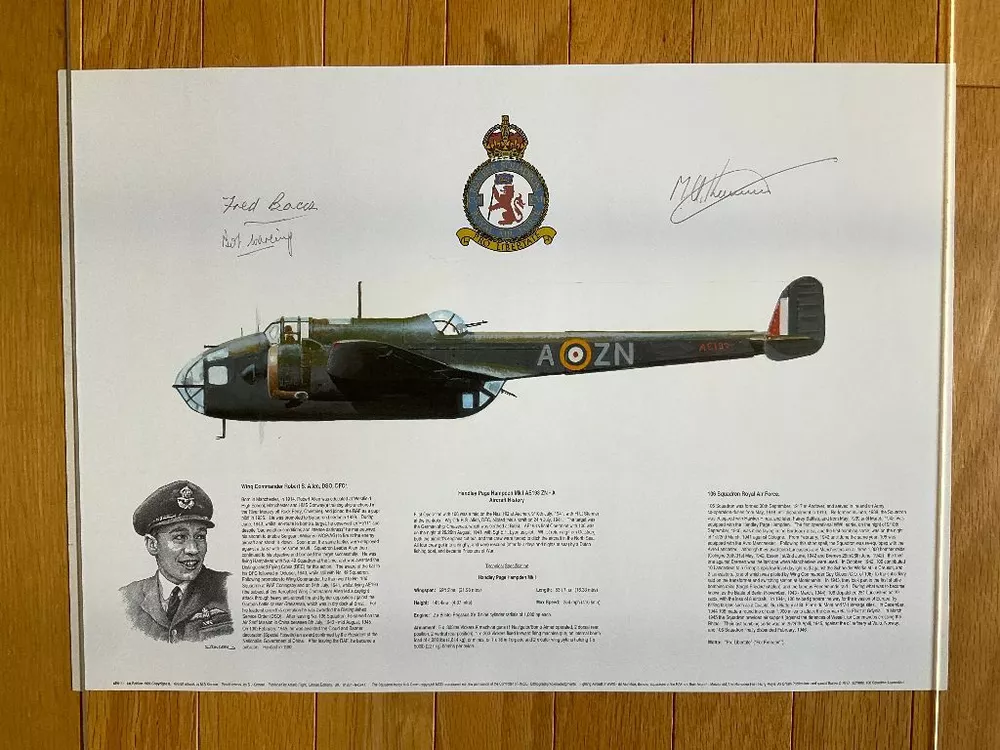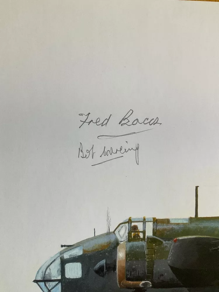 Attention Collectors!!! You are bidding on a fabulous print by the artist and RAF WWII pilot! You are bidding on a beautiful print that is for Wing Commander Robert S. Allen and the Handley Page Hampden bomber. Commander Allen flew the first mission of this type of plane. The print is signed by the artist, M A Kinnear, and two other people. One signature is from Bob Wareing. I am not sure who the second signature is from and requires some research. Pilot Officer Robert WAREING, Royal Air Force, No. 106 Squadron. One night in April, 1941, this officer was captain of an aircraft detailed to carry out a low level attack on two enemy battle cruisers at Brest. When making his attack, Pilot Officer Wareing came down to 1,000 feet but owing to the darkness he was short of his target. He was immediately met by a terrific anti-aircraft barrage and searchlights. Despite this, he pressed on but was unable to identify his target. Undaunted, however, he decided to make another attack and, regaining height, flew over the target area for about 40 minutes and finally made a successful attack on one of the ships dropping an extremely heavy bomb which was seen to burst either on the ship or on the dockside. This officer displayed great coolness and courage in the face of tremendous opposition. Bob Wareing flew operations as a pilot with 106 Squadron. After a period of instructing he returned to operations on 582 Squadron but was shot down and became a prisoner of war. The print measures approximately 16 1/2" by 11 1/2". It is just waiting to be matted and framed and proudly displayed! What a terrific and rare dual signed print! Wonderful gift idea! This would make a great addition to any aviation or military collection! (Inventory: Mailing Tube #2) Track Page Views With Auctiva's FREE Counter