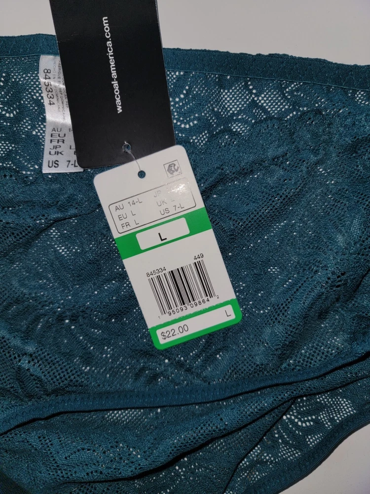 This is a dark teal Wacoal hi-cut brief panty made of stretch lace with floral lace pattern and embroidered scalloped accents. It is a glamorous and elegant underwear piece for women, featuring a high-rise design, high leg cut, and breathable nylon/spandex material. The semi-transparent lace fabric adds a romantic and classic touch to this stylish lingerie.