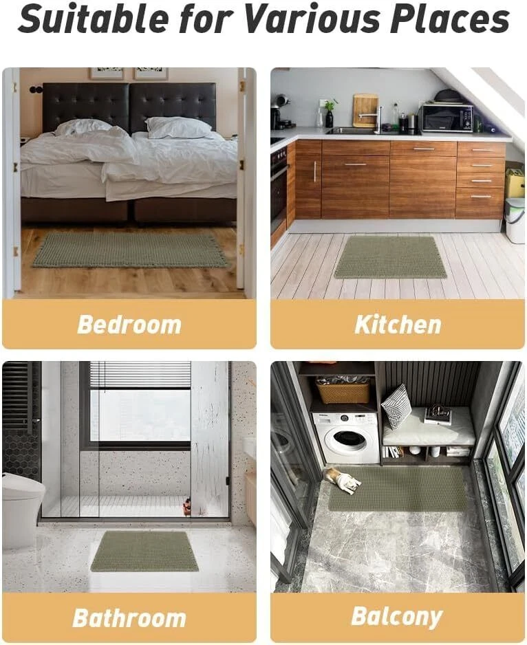 Upgraded Waffle Desgin: This boho bath mat is power-loomed with upgraded yarns-Integrating decoration and durability. The heavier and thicker threads are applied to make sure the pattern will be more solid and compact- NEVER OUT OF SHAPE! Great Water Absorption: Double layer of deep waffle texture absorbs water instantly and more breathable. In addition, the yarns we use is inherently absorbent-it absorb water like crazy. This absorbent bath mat can soak up the water and keep your floor dry like a giant sponge, and protect your feet from the cold floor. Clear Rubber Backing: This non slip bath mat is designed with clear rubber backing(HMA-Hot Melt Adhesive, invisible but touchable). This bathmat firmly grips the ground to prevent you and your families from falling. Comfortable and Soft: Three-dimensional waffle design combined with flexible yarns make the bathroom floor mat softer and cozier. Bring you a comfortable underfoot feeling. Enjoy a comfort space when you finishing shower. Easy to Maintain: Machine washable bathroom rugs provide convenience in your daily life. Recommend gentle mode,cold water. Or just shake the dust off from the bath rugs for simple cleaning. Size 17" x 60" Material Polyester Weave Type Machine Made Pile Height Low Pile Construction Type Machine Made Back Material Type Rubber Color Green Indoor/Outdoor Usage Indoor Product Care Instructions Machine Wash, Hand Wash Only Pattern Waffle Special Feature Absorbent, Lightweight, Quick Dry, Non Slip, Washable Room Type Entryway, Bathroom, Kitchen, Bedroom, Hallway Product Dimensions 60"L x 17"W Rug Form Type Runner Style Boho Occasion Housewarming Seasons Winter, Summer, Fall, Spring Item Weight 1.46 pounds