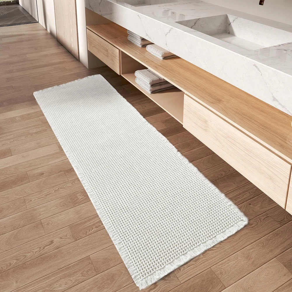 Upgraded Waffle Desgin: This boho bath mat is power-loomed with upgraded yarns-Integrating decoration and durability. The heavier and thicker threads are applied to make sure the pattern will be more solid and compact- NEVER OUT OF SHAPE! Great Water Absorption: Double layer of deep waffle texture absorbs water instantly and more breathable. In addition, the yarns we use is inherently absorbent-it absorb water like crazy. This absorbent bath mat can soak up the water and keep your floor dry like a giant sponge, and protect your feet from the cold floor. Clear Rubber Backing: This non slip bath mat is designed with clear rubber backing(HMA-Hot Melt Adhesive, invisible but touchable). This bathmat firmly grips the ground to prevent you and your families from falling. Comfortable and Soft: Three-dimensional waffle design combined with flexible yarns make the bathroom floor mat softer and cozier. Bring you a comfortable underfoot feeling. Enjoy a comfort space when you finishing shower. Easy to Maintain: Machine washable bathroom rugs provide convenience in your daily life. Recommend gentle mode,cold water. Or just shake the dust off from the bath rugs for simple cleaning. Size 17" x 60" Material Polyester Weave Type Machine Made Pile Height Low Pile Construction Type Machine Made Back Material Type Rubber Color White Indoor/Outdoor Usage Indoor Product Care Instructions Machine Wash, Hand Wash Only Pattern Waffle Special Feature Absorbent, Lightweight, Quick Dry, Non Slip, Washable Room Type Entryway, Bathroom, Kitchen, Bedroom, Hallway Product Dimensions 60"L x 17"W Rug Form Type Runner Style Boho Occasion Housewarming Seasons Winter, Summer, Fall, Spring Item Weight 1.43 pounds