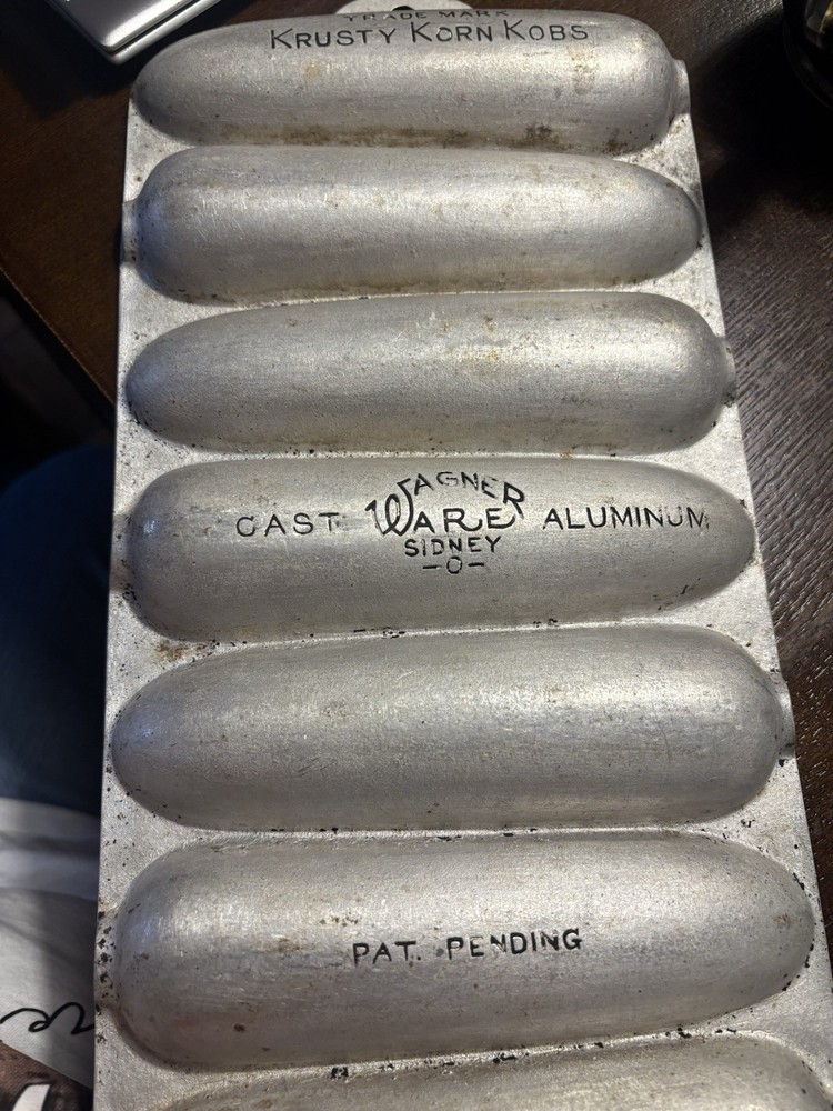 Wagner Ware Krusty Korn Kobs Cast Aluminum Cornbread Pan. This pan is an amazing find. It is considered a “senior” and was one of their first pans before the “junior” was produced in the 1920s. I’m not sure of the exact date this was produced but know it was before the 1920s. It’s an original piece in good condition.