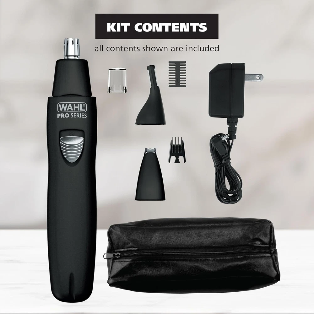 Store New Arrivals Add to Favorite View Feedback Contact Wahl Pro Series® Rechargeable Eyebrow, Ear & Nose Hair Trimmer for Men – Painless Dualtech® Eyebrow Trimmer & Facial Hair Removal Device – Model 3025656 Description Item model number 3025656 Style Pro Series Power Source Battery Powered Color Black Brand Wahl Country of Origin Vietnam Package Dimensions 9.37 x 5.04 x 2.13 inches; 11.64 ounces Recommended Uses For Product Face Hair Type All Manufacturer Wahl Multi-Purpose Trimmer – This versatile trimmer for men includes a precision trimming head for intricate detail trimming around the beard & mustache, a rotary head for hassle-free nose and ear trimming, and a DualTech hair trimmer ideal for grooming eyebrows. Precision Trimming – Achieve even eyebrow hair lengths with the included eyebrow trimmer and guide comb, offering four different trimming lengths for easy and accurate results. Attach the included small detail guide to the detail trimming head to achieve precise cutting lengths in those intricate grooming areas. Hygienic Grooming – The multi-head design allows you to easily switch between detachable heads on this Wahl trimmer to suit your various grooming needs and makes the heads easy to clean by simply removing and rinsing. Extended Run Time – Enjoy up to 2 hours of use on a full charge, providing ample power for multiple grooming sessions without frequent recharging. The Brand Used by Professionals - Wahl clippers and trimmers have been used by professionals in the salon & barber industry since 1919. Wahl Pro Series® Rechargeable Eyebrow, Ear & Nose Hair Trimmer for Men is perfect for eyebrow, detail, and nose hair trimming. Designed for versatility, this eyebrow trimmer features a precision detail attachment for intricate detailing around the beard and mustache, a rotary trimming head for hygienic nose and ear hair removal, and a DualTech® double sided detail trimmer for shaping eyebrows. Attach the included multi-length guide comb to the DualTech® trimmer head to achieve up to 4 different eyebrow trimming lengths or add the small detail guide to the detail trimming head to achieve precise detail cutting lengths or intricate hair trimming designs. Enjoy cordless power with up to 2 hours of run time on a full charge and extended runtime without the constant need to recharge, making it perfect for multiple grooming sessions. Hygiene is made easy with the detachable stainless steel heads. Simply remove the heads from the trimmer body, rinse with water, and allow time to dry before reattaching. To add further protection and to ensure longevity of your nose hair trimmer head, attach the included protective cap during storage. Also included in this nose hair trimmer for men is a storage pouch to hold all of the accessories in one place. Durable and convenient, this grooming kit for men is your go-to tool for a well-trimmed look. Note: We test our Wahl hair trimmers for men for cutting performance prior to packaging with a hygienic fiber. We do our best to clean the product to remove any testing particles, but it is possible a few may remain. They are not hair and can be simply wiped off. Item includes a USA plug for USA outlets. ABOUT US We offer the best prices around on high quality products. Our E-store includes media such as books, movies, music and games while offering electronics, toys, sporting apparel, clothing, tools, general home, garden items and more. SHIPPING We are always working hard to ensure your package arrives as soon as possible. Please understand that some factors like weather, high postal traffic, and the performance of shipping companies are outside of our control. We offer free shipping to the lower 48 states and ship within 2 business days of payment, usually sooner. We do not accept P.O. Boxes. Please provide a physical address. RETURNS We offer a 30-Day Return Policy on items which you are not completely satisfied with. You have the option for a full-refund or an exchange of the item. No returns are available on items shipped outside of the USA. PAYMENT We accept PayPal. CONTACT US This page content is yet to come Please ad us to your favorite seller and visit again later Thank You CUSTOMER SATISFACTION We try our very best to make sure every customer is completely satisfied. If there's a problem, message us! We're happy to help.