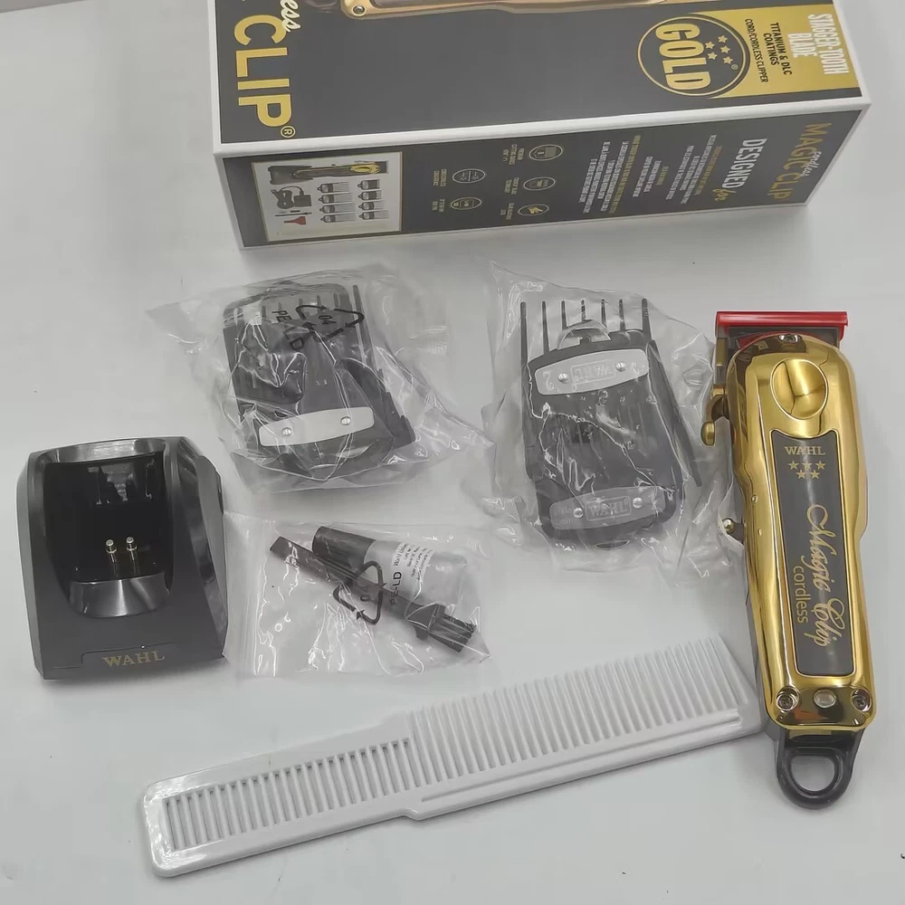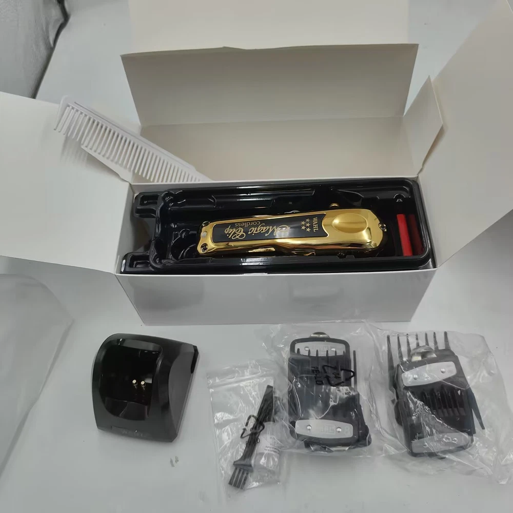 Product Description Features: 1-STYLISH AND FUNCTIONAL: The Limited Edition Black & Gold Cordless Magic Clip is the ultimate cordless clipper. It features high precision zero-overlap 2161 blades that offer superior speed and ease of use, a convenient taper lever for easy fading and blending, and a lithium ion battery for a 90+ minute run time per charge. Cord/cordless cutting capability. 2-ACCESSORIES INCLUDED: For your convenience, the 5-Star Limited Edition Black & Gold Cordless Magic Clip comes with all accessories required for use. PRODUCT SPECIFICATIONS: The 5-Star Limited Edition Black & Gold Cordless Magic Clip (#8148-700) measures 6.25” long and weighs 10 oz. Operates at 120 volts/60 hertz Package Include: As shown in the figure Return policy About us Contact us Shipping If you need return, let us know the detailed problem and send us some pictures for confirmation. Then get an address for return or refund. 1.Customers may return an item for refund or exchange within 30 days after the item is received. Items must be returned in their original shipping and item packaging and should not be used. 2.We only accept our own parts without any broken. 3.Customers are responsible to the shipping back cost if you buy our item by mistake or change your mind. 4.Refund will only send once we receive the part from you without any problem.thanks 5.If a defective received (seldom happened), we will refund you or ship a replacement to you according to our inventory. (Not included the postage). 1. We value our customers tremendously. We are learning and improving our service better and better, and your satisfaction is the first thing that we pursue. 2. If any problem occurs, please contact with us at the first time. 3. Then we will try our best to solve the problem and make you pleased 4. And if you are pleased with this transaction, please don’t hesitate to leave a POSITIVE FEEDBACK and FIVE STARS on all of the Detail Seller Ratings. We will do the same for you. If have any problem, Please don't give negative feedback, Please contact us by message, we will do our best to service you .Thanks very much and have a good day! 1. Your order will be usually shipped out on the same day or the next day when you paid for it. 2. Shipping from the USA. 3. Handling time: 2 business day and 3 business day on weekend (Orders are not processed on holidays).Item is shipped to ebay address. Please leaving correct address can minimize delay. Return policy If you need return, let us know the detailed problem and send us some pictures for confirmation. Then get an address for return or refund. 1.Customers may return an item for refund or exchange within 30 days after the item is received. Items must be returned in their original shipping and item packaging and should not be used. 2.We only accept our own parts without any broken. 3.Customers are responsible to the shipping back cost if you buy our item by mistake or change your mind. 4.Refund will only send once we receive the part from you without any problem.thanks 5.If a defective received (seldom happened), we will refund you or ship a replacement to you according to our inventory. (Not included the postage). About us 1. We value our customers tremendously. We are learning and improving our service better and better, and your satisfaction is the first thing that we pursue. 2. If any problem occurs, please contact with us at the first time. 3. Then we will try our best to solve the problem and make you pleased 4. And if you are pleased with this transaction, please don’t hesitate to leave a POSITIVE FEEDBACK and FIVE STARS on all of the Detail Seller Ratings. We will do the same for you. Contact us If have any problem, Please don't give negative feedback, Please contact us by message, we will do our best to service you .Thanks very much and have a good day! Shipping 1. Your order will be usually shipped out on the same day or the next day when you paid for it. 2. Shipping from the USA. 3. Handling time: 2 business day and 3 business day on weekend (Orders are not processed on holidays).Item is shipped to ebay address. Please leaving correct address can minimize delay. powered by