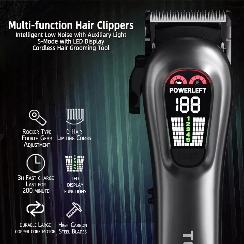 Hair Clippers for Men Professional Hair Trimmer for Men - Cordless&Corded Barber Clippers for Hair Cutting & Grooming, Rechargeable Hair Trimmer Kit for Household(Silvery)… About this item 【CORDLESS&CORDED】TCMKY Hair trimmer can be with cord or cordless which is super convenient for self-cutting. USB charging 3Hours - One full charge Last up to 200 minutes of use.When the power of the hair clipper is used up,This hair trimmer supports plug and play.When charging, The charging capacity can be seen from the display.When the power in the display screen is 100%, unplug the power cord 【High Performance Sharp Steel Blade】: The blade of this hair clippers is sharp, durable and efficient. Precise clearance design improves its safety performance. The depth is close to the skin, and the trimming and friction are small, which will not hurt the skin 【Auxiliary Lighting】 The TCMKY hair clipper is equipped with a suitable lighting option, which is located at the head of the hair clipper. Push the power switch upward to start the hair clipper, and then press and hold the 【SMART]】button for 3 seconds to turn on the lighting function. When traveling, you can efficiently trim even without lighting. 【Professional Hair Clipper&LED Display】- TCMKY Professional Hair Clipper which can display the remaining power,charging reminder indicator and Blade lubrication reminder indicator. Our ultra-high definition LED display provides you with all information to ensure that you use it correctly. In addition, it includes a full-size guide comb to meet your need for trimming your head and face. Due to its low noise and safety blade, it is also suitable for children or young children to have a haircut 【Power Adjustable of 5th Gear 】 When the hair clippers is started for the first time, the default is 1st gear, and the [SMART] button is the gear selection button. Each time this button is pressed, it will increase one gear until the maximum gear 5 is reached. Similarly, this machine has memory function. When the machine is powered off in any gear from 1st gear to 5th gear, the machine will remain in the gear before the power off. It is convenient to remember your most frequently used gear 【Low Noise, Performance Rotary Motor】 The electric clipper's motor is powerful enough to cut through even the thickest hair with ease. The teeth on the blade are tightly line up with each other to remove hair with no snagging or pulling, offering an effective haircut.if you feel any problem. Please contact us,We will provide you a satisfactory solution. 🚚 2 -Day Shipping Receive your order at your doorstep within just 2 day of purchase. We understand the importance of timely delivery and strive to get your products to you as quickly as possible. 🔁 30-Day Free Returns: 24 hour customer support
