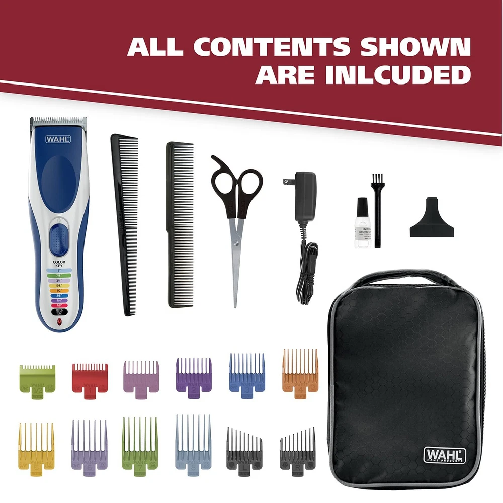 Wahl Professional Hair Cut Machine Barber Salon Cutting Trimmer Clipper Kit Set Cordless Convenience – Color Pro Cordless is rechargeable and wireless. Cord/Cordless allows you to use the clipper on battery or when it's charging. Color Coded Guide Combs – Finding and remembering everyone’s favorite hair length is easier than ever. Corresponding the correct comb to the right cutting length is simple with our easy-to-see attachment guards. Hygienic Grooming – Since our blades are removable and rinsable they are easy to clean. Simply run them under water to wash away excess clippings and trimmings. Smooth, Easy Haircuts – With a variety of cutting lengths, adjusting the trim length is pain free. Quickly reference the color key on the face of the clipper and attach the corresponding colored clipper comb attachment. Grooming on the Go – With 60 minutes of run time, our Cordless Color Pro is great for travel, vacation, business trips, and more. Worldwide voltage means you can use no matter what country you’re in, 220v or dual voltage. Perfect Gift – Wahl clippers, trimmers, massagers, and shavers make great Christmas gifts for women and men. Give the gift of Wahl this holiday season. Recommended Charge Cycle - To maximize the health & life of the unit battery, charge the unit in full at least every 6 months The Wahl Color Pro Cordless Clipper kit features color-coded combs that make it quick and easy to find the right comb size. The convenient color code guide on the clipper helps make it easy to identify the right size and comb color in seconds. Finding and remembering everyone’s favorite hair length is easier than ever. Corresponding the correct comb to the right cutting length is simple with our easy-to-see attachment guards. With a variety of cutting lengths, adjusting the trim length is pain-free. Quickly reference the color key on the face of the clipper and attach the corresponding-colored clipper comb attachment. The clipper powerful, long-lasting rechargeable battery with a run time of up to 60 minutes. Clipper can be used with or without a cord for ultimate convenience. Includes a self-sharpening stainless-steel blade with outstanding cutting performance. The stainless-steel blade can also easily be removed for easy cleaning. Color Pro Cordless is rechargeable and wireless. Cord/Cordless allows you to use the clipper on the battery or when it's charging. Since our blades are removable and rinseable they are easy to clean. Simply run them under water to wash away excess clippings and trimmings. The Color Pro Cordless color-coded haircutting kit includes the clipper with blade guard, a complete set of color-coded attachment guards, haircutting accessories, and full-color instructions with step-by-step guidance for an easy goof-proof at-home haircut. A premium hard storage case is also included for added convenience. Worldwide voltage (110 - 240V) for universal use at home or internationally. The product in the packaging may not be the same as in the photo due to continuous improvements to the product. Note: We test our clippers for cutting performance prior to packaging with a hygienic fiber. We do our best to clean the product to remove any testing particles, but it is possible a few may remain. They are not hair and can be simply wiped off. Shipping We offer FREE shipping on all orders! We ship within Three business days of payment, usually sooner. We use a selection of shipping services such as UPS, FedEx, USPS etc. We only ship to the lower 48 states, no APO/FPO addresses or PO Boxes allowed. Local pickups and combined shipping options are not provided at this time. Return You can return a product for up to 30 days from the date you purchased it. Any product you return must be in the same condition you received it and in the original packaging. Please keep the receipt. Payment We accept payment by any of the following methods: PayPal Please pay as soon as possible after winning an auction, as that will allow us to post your item to you sooner! Feedback Customer satisfaction is very important to us. If you have any problem with your order, please contact us and we will do our best to make you satisfied. Contact Us If you have any queries, please contact us via ebay. We usually respond within 24 hours on weekdays. Please visit our eBay store to check out other items for sale! Thank you for shopping at our store.