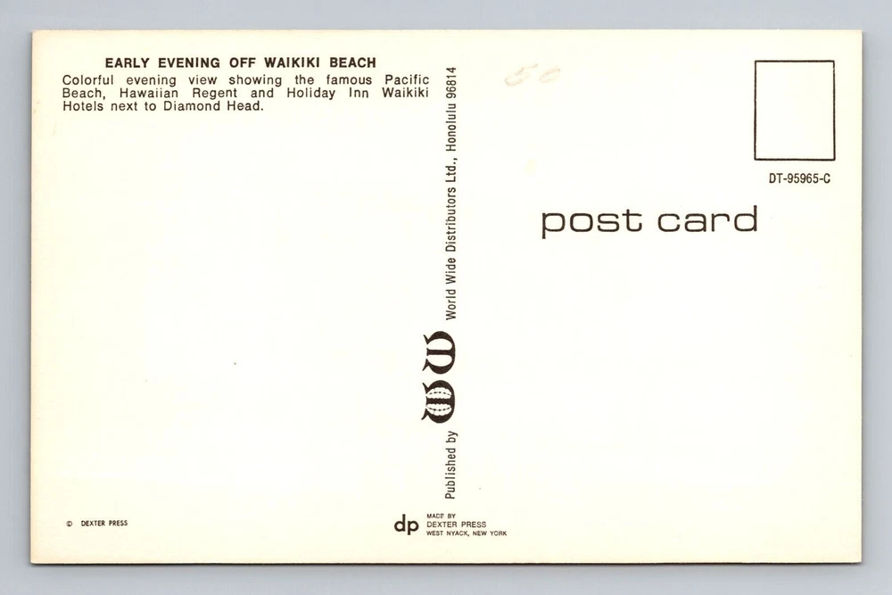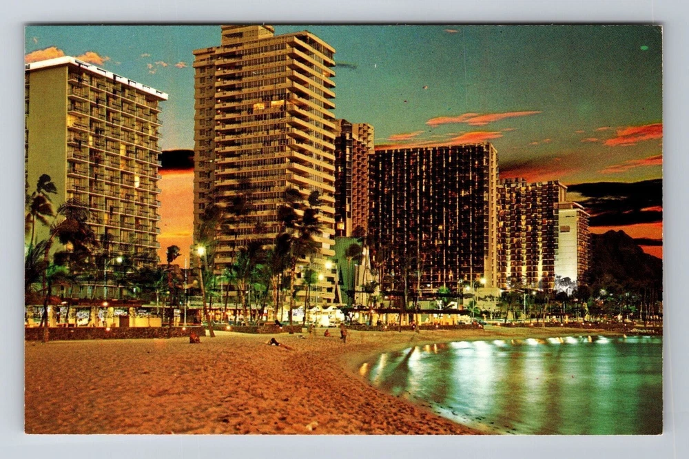 Waikiki Beach HI-Hawaii, Early Evening, Hotels, Antique, Vintage Postcard