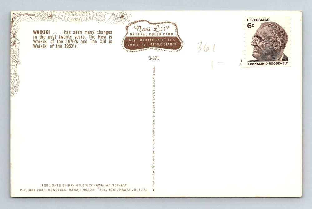 City: Waikiki Subject: Cities & Towns Region: Hawaii Type: Printed (Lithograph) Original/Licensed Reprint: Original Postage Condition: See Image Theme: Cities & Towns Unit of Sale: Single Unit Country: USA Era: Vintage Country/Region of Manufacture: Unknown
