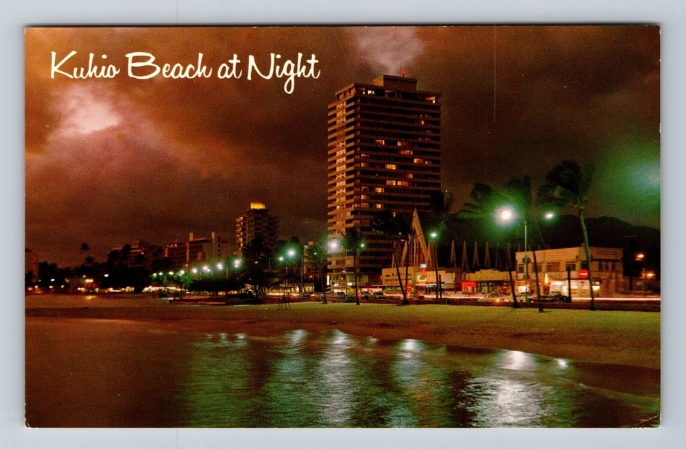 Waikiki HI-Hawaii, Kuhio Beach At Night, Antique, Vintage Postcard
