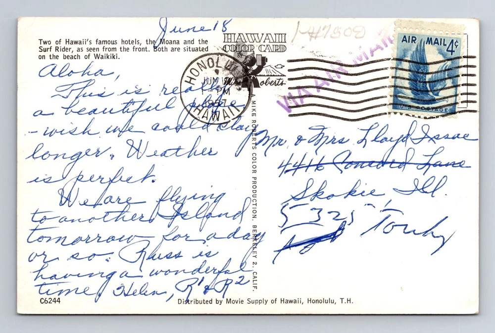 Type: Printed (Lithograph) Postage Condition: Posted Material: Paper Era: Vintage Country/Region of Manufacture: Unknown Theme: Cities & Towns Region: Hawaii Size: Standard (5.5 x 3.5 in) Original/Licensed Reprint: Original Unit of Sale: Single Unit Subject: Cities & Towns City: Waikiki Country: USA