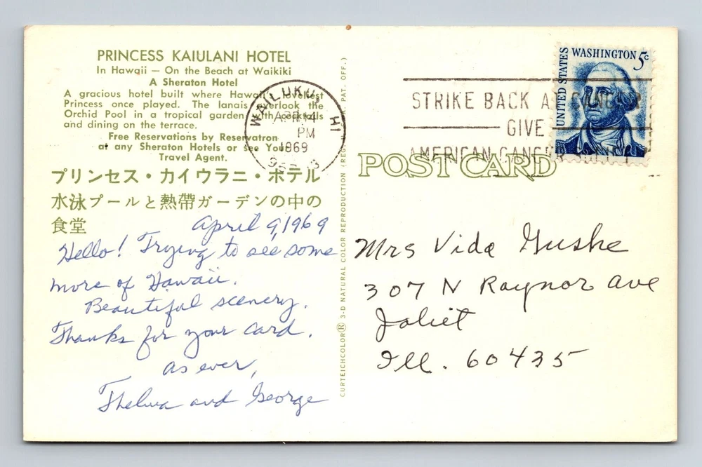 Waikiki HI-Hawaii, Princess Kaiulani Hotel, c1969 Vintage Postcard