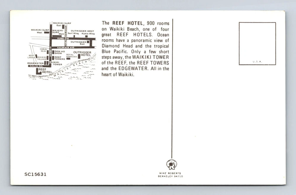 Waikiki HI-Hawaii, Reef Hotel, Sailing and Beach, Souvenir Vintage Postcard