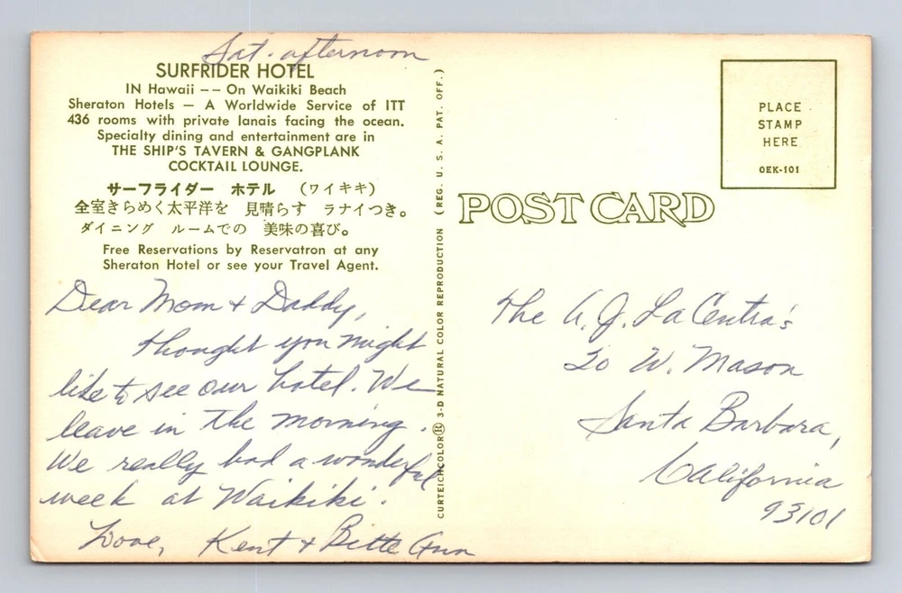 Waikiki HI-Hawaii, Surfrider Hotel, Souvenir, Vintage Postcard