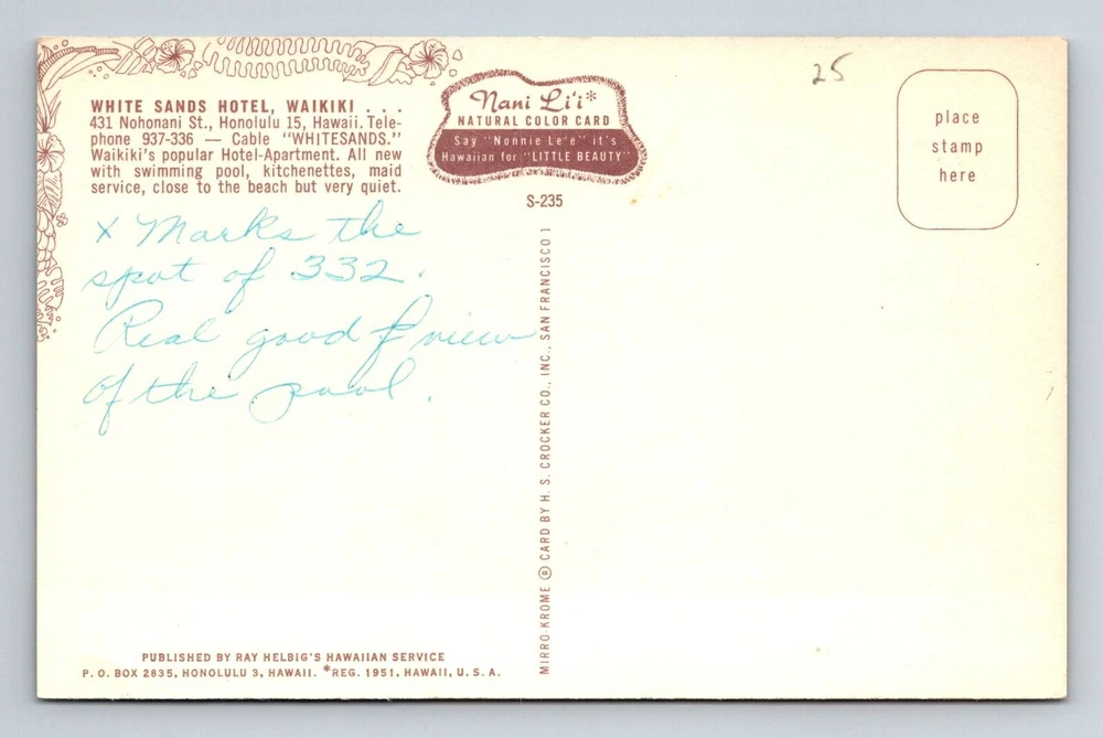 Waikiki HI-Hawaii, White Sands Hotel, Advertisement, Vintage Postcard