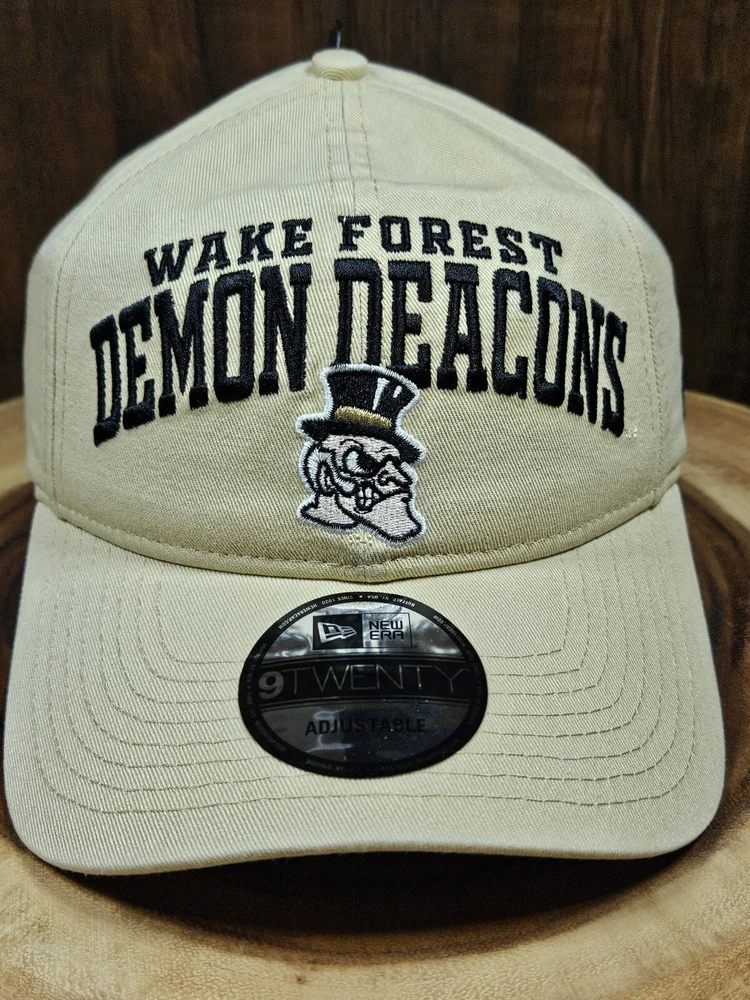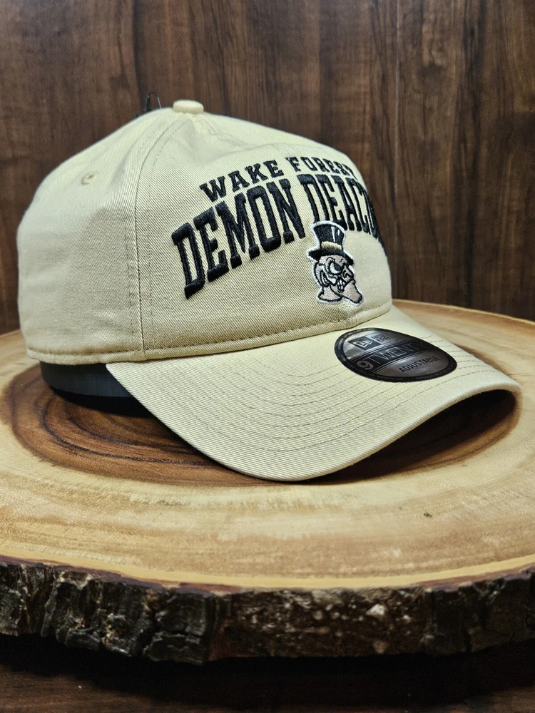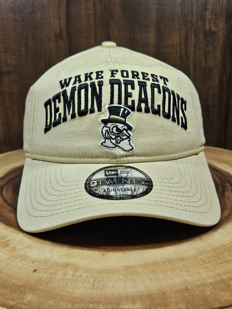 The Wake Forest Demon Deacons New Era 9Twenty Buckle Strapback Adjustable Dad Hat is a baseball cap made for men. It features an adjustable strapback and is designed with a solid gold color and the team's name embroidered on the front. This hat is suitable for various occasions such as travel, party/cocktail, casual, workwear, and business. It is also ideal for those who are into streetwear, university, dad, college, and sports themes.