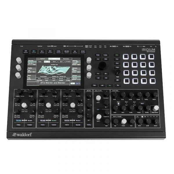 Category 500 Series Modular Synth Keyboards Microphones Preamps Dynamics Equalizers Monitoring Computer Audio Interfaces Software Beat Production Waldorf Iridium Digital Polyphonic Desktop Synthesizer (Demo / Open Box) The Waldorf Iridium has made the impossible possible. The mighty synth engine from Quantum is now available in a compact form. Tracing the footsteps of its bigger brother, Iridium features all the synthesis elements of Quantum as well in a rack-compatible format. The combination of the powerful engine, incredible flexibility and detailed sound shaping facilities creates sheer endless possibilities of sound. Yet, the comprehensive layout and easy-to-understand structure lets you design your own sounds in no time. Sporting a solid metal casing and the same high level of craftsmanship like Quantum, Iridium is now ready to take over studios and stages throughout the world. Contributing another entry in Waldorf's rich history, Iridium joins the family as a direct descendant of the PPG Wave. Though, Iridium offers much more than its ancestor. Five different synthesis models are provided by Iridium for each of the three oscillators: Wavetable Waveform (Virtual Analog) Particle (Sampling and Granular Sampling) Resonator Kernels Kernel mode has been introduced with the OS 2.0 of Quantum. This huge upgrade allows one oscillator to be turned into up to six sub oscillators. These can be interlinked through FM at audio rate and arranged in user-definable constellations. Just this upgrade alone would have provided enough additional features to create a synthesizer on its own. Now, all those functions have been integrated into Iridium as well. Up to 7000 patches can be saved in Iridium. Patches from Quantum can be loaded in Iridium and vice-versa. Iridium features three digital filters per voice. Two in the Dual Filter section and another one in the Digital Former. Several types are available to choose from: 12 or 24dB and Lowpass/Highpass/Bandpass with optional saturation or dirtiness. Various filter models are available including those from Waldorf Nave, Largo and PPG 3V. The Dual Filter section can be controlled independently or together in several different link modes. The Digital Former offers all the filter types and models from the Dual Filter plus unusual models like Comb, Drive, Bitcrusher and more in addition. All filters retain a true stereo signal throughout the entire structure of the instrument. Up and down, back and forth 6 Envelopes, 6 LFOs and many more are just waiting for being used as sources in the 40 slots of the Modulation Matrix. Each slot has one additional control amount. Modulations can be directed to almost every numerical value in Iridium. All sources and destinations can be used as many times as desired until the Modulation Matrix is full. If you ever happen to run out of LFOs or Envelopes, you can use the Komplex Modulator for generating a custom shape LFO or Envelope. Complex, but not complicated Even though Iridium features a staggering amount of parameters to control, everything is organized in a logic structure which is easy to master. The major controls have their own dedicated knob, while the rest is accessible through the touch screen and the encoders around. There are no long menus keeping you from doing what you had planned. Instead, you will find a workflow which you will soon miss on other synthesizers. Hands-on Embedded in the front panel, a 4x4 silicon pad matrix invites you to launch notes, chords, arpeggios and sequences with up to 32 steps for notes and multiple parameter lines. Direct access to the parameters is granted by the seven encoders to the left and the right hand side of the touch screen. Take a look inside! Iridiums large color touch screen keeps you informed at all times. Upon moving a knob, Iridium gives you an optical feedback of your changes in real-time. Filter curves move, Particle grain sizes change, Envelopes warp and much more: Komplex Modulator curves can be drawn with your finger Envelopes show at which point the voices currently are Wavetables are displayed in comprehensive view modes VU meters show which voices are used and the individual voice levels Different Analyzers show the audio signal at different points Get connected Two Audio Outputs allow you to listen to Iridium, while two Inputs allow Iridium to process external signals. 4 CV inputs plus Gate In and Trigger In are ready to forward external signals to the Mod Matrix. Furthermore, Clock In and Clock Out will get your gear in sync. MIDI connections can be made through USB and DIN MIDI. Iridium is also equipped with a USB Host port for MIDI devices. This port also handles data exchange, in addition to the MicroSD card slot. About Us Since 1993, we have been committed to equipping our customers with the very best gear, advice, and personal service anywhere. We believe that great sound can be achieved at any budget. We also believe that the ambitions of our customers should always come first. For us, it's about building long-lasting relationships, not just selling gear. And over the years, those beliefs have turned customers into friends and family. Whether you're just starting out, or a seasoned pro, we're here for you, no matter where your audio travels may take you. Shipping Policy Free ground shipping to the lower 48 states Via FedEx. All of our items ship via FedEx. On checkout, it may look like you are selecting a UPS shipping method, but the item will be shipped via the equivalent FedEx method. Import Duties and Tax Since import taxes and/or duties that your government might impose on products shipped from the United States may apply, you (the customer), are solely responsible for shipping charges, taxes, and duties, once goods arrive in your country. Undeliverable/Rejected Package If your package was rejected by your local Customs Bureau or the shipment could not be delivered and was returned to Vintage King Audio for any reason, we are not responsible 
