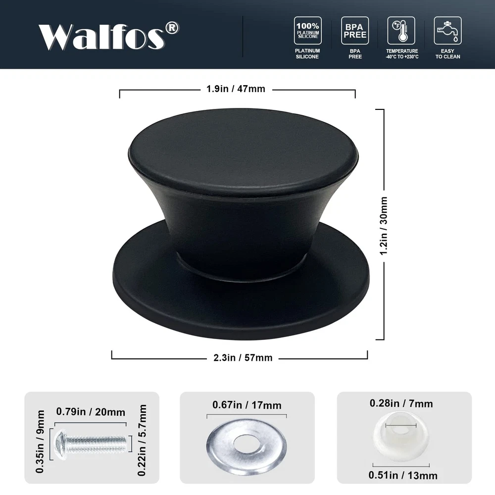 Walfos Universal Silicone Pot Lid Replacement Knob, Heat Resistant Pan Lid Holding Handles, BPA Free,Dishwasher Safe, Great for Slow Cookers, Skillets and Kitchen Cookware Covers, 1 Pack LONG-LASTING POT LID KNOBS REPLACEMENT - Compared to the plastic pot lid knob, WALFOS universal silicone pot lid handle is sturdy and long-lasting, and won't broke or crack. Also the soft and ergonomic design make you comfortable to grip the pan lid knobs. An ideal choice to replace your old or broken ones. HEAT RESISTANT & NON-SLIP - WALFOS BPA free and food grade silicone pot lid handle replacement is heat resistant up to 450°F, making you stay cool to touch and prevent your hand from being injured. Moreover, the NON-SLIP silicone allows you to easily lift your lid. No more worrying about getting scalded or easily slipping the lid off. VERSATILE - Whether it's an oval or round lid, whether it's a tempered glass or stainless steel lid, this pan lid handle will work, suitable for slow cookers, skillets, kettles, saucepans, frying pans, etc., meeting most lids with a mounting hole (Please make sure the hole diameter is larger than the diameter of the silicone washer-7mm). EASY TO INSTALL & CLEAN - Come with 1 x knobs, 1 x screws, 1 x silicone washers and 1 x stainless steel washers, you can install the silicone pan lid handle replacement by your yourself without any trouble. And the non-stick spot lid replacement knobs are super easy to clean, dishwasher safe or you can just rinse with water. SATISFACTION GUARANTEE - We are so confident you'll think we have the best knobs for pots on the market. If you have the slightest problem with our product, please feel free to give us a message and we will send you a new one right away without any cost on your side or full money back. We go out of our way to make sure every customer is happy and satisfied with our product and service.