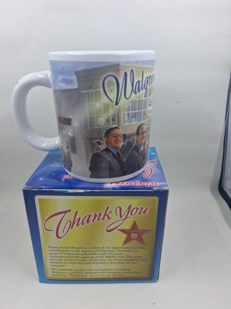 The product is a Walgreens 4000th store coffee mug from Hollywood, Van Nuys, California, created in 2003. The mug features a multi-color design and is a collectible advertising item. Made in China, this mug commemorates a milestone in Walgreens' history and would be a unique addition to any Walgreens merchandise or memorabilia collection.