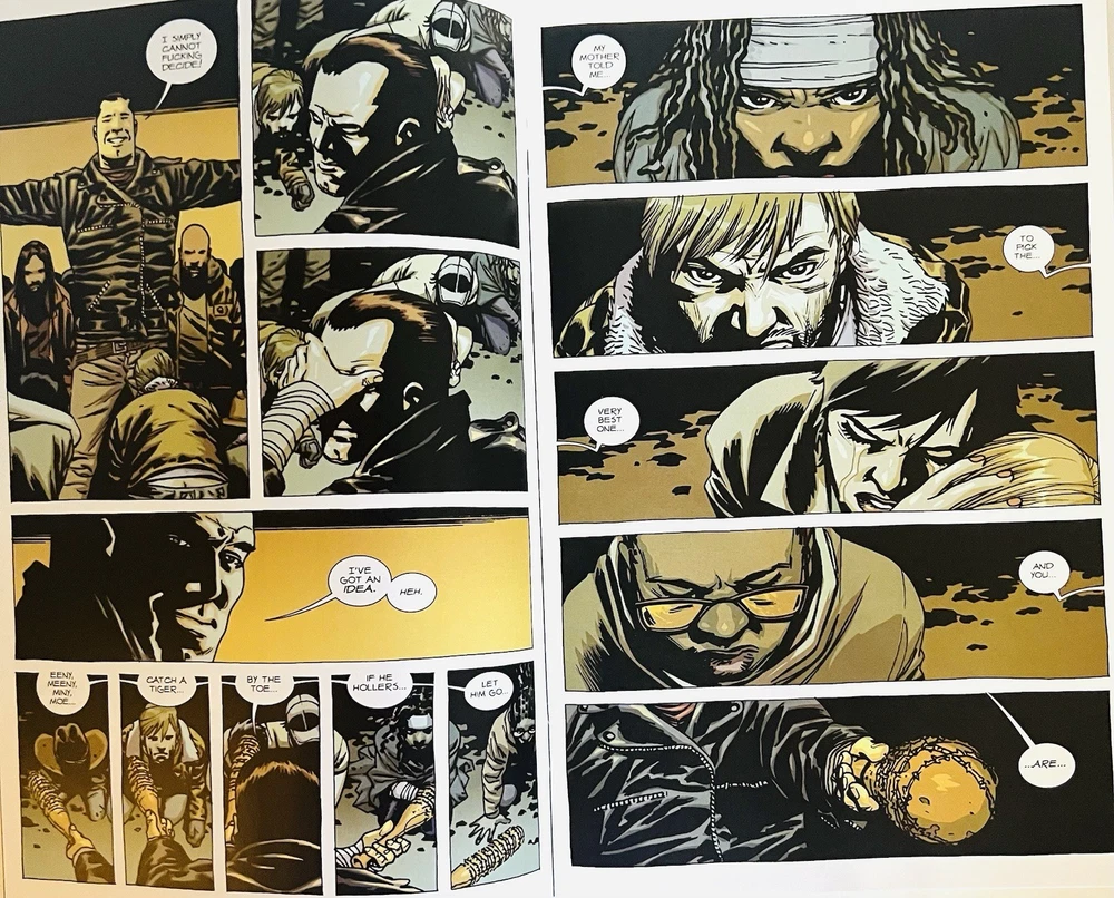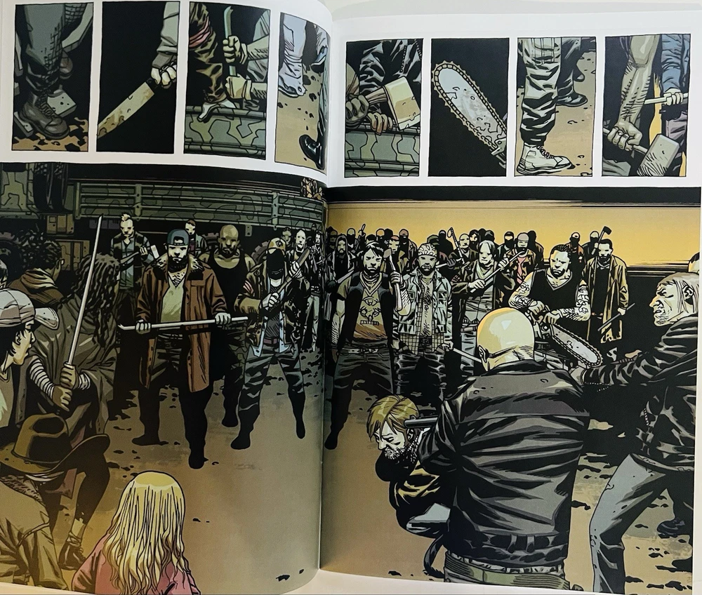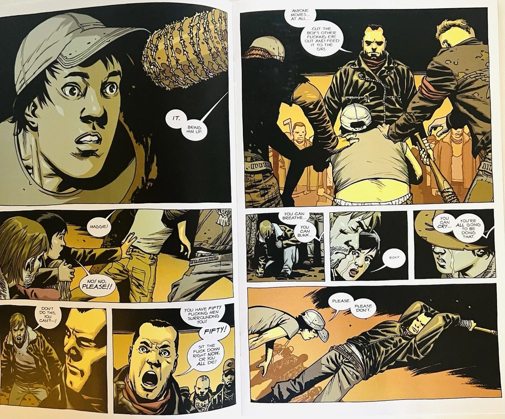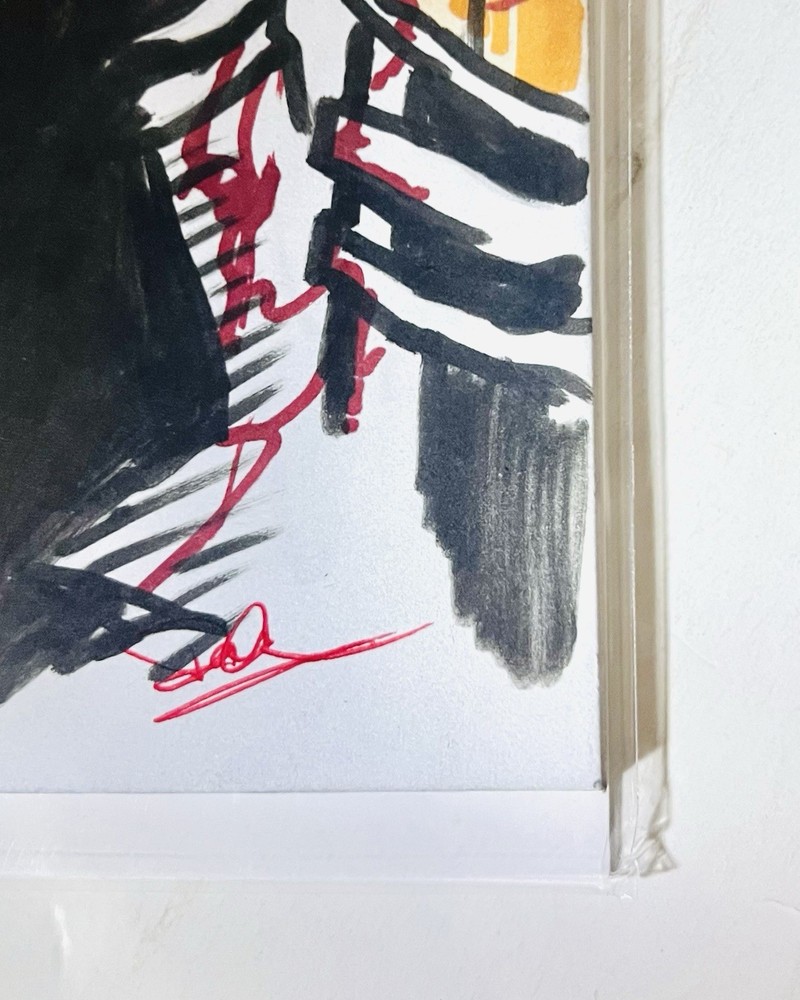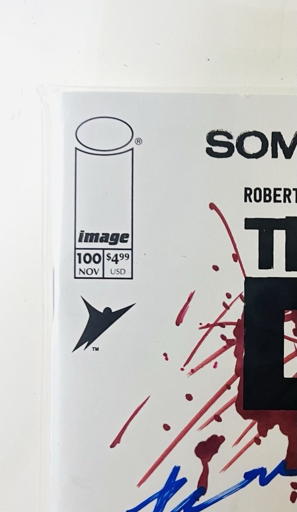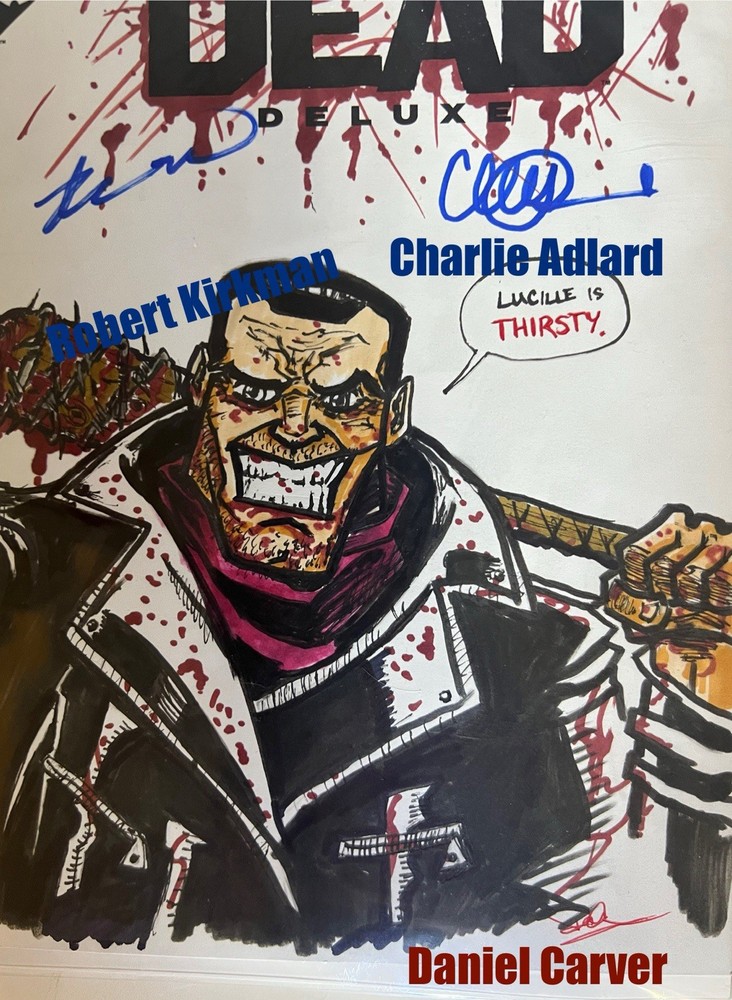 The product is a signed deluxe #100 blank cover variant of The Walking Dead comic book by Robert Kirkman and Charlie Adlard. This single issue features original sketches of characters like Rick Grimes, Negan, and Ezekiel. The variant cover was illustrated by Daniel Carver and includes a personalized sketch of Negan. Published by Image Comics, the comic falls under the genres of adventure and horror & sci-fi, and is part of the modern age era with a publication year of 2024. This key issue features the horrifying debut of Negan to the Walking Dead storyline.