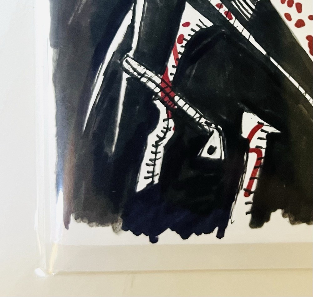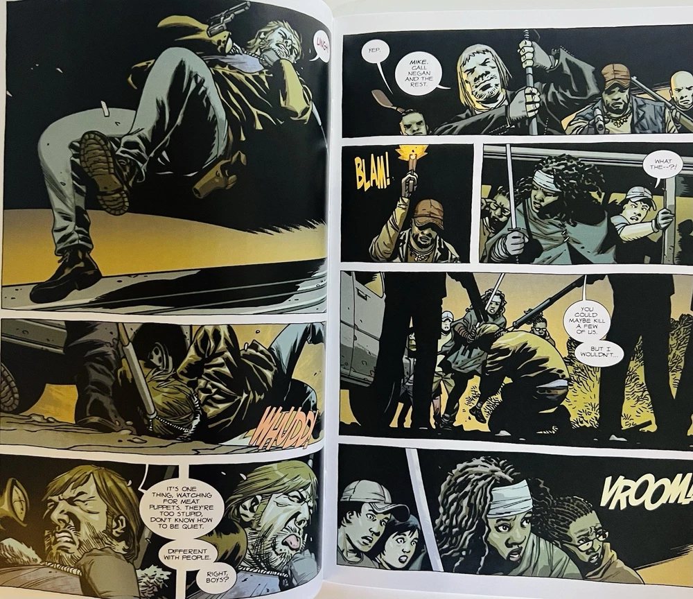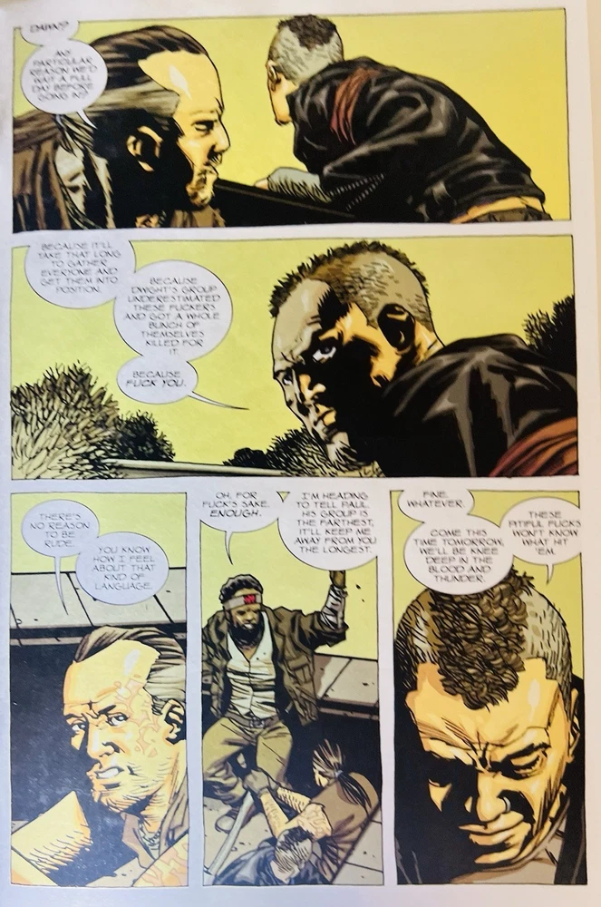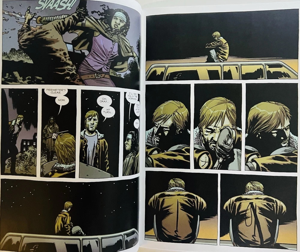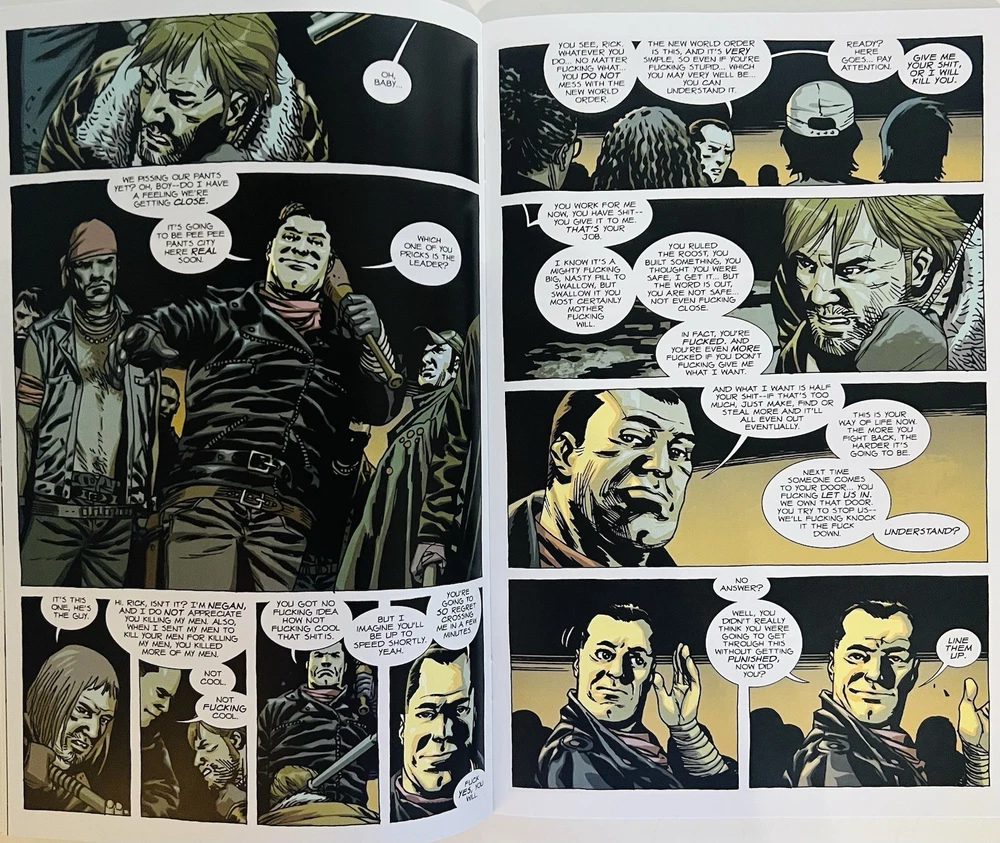 The product is a signed deluxe #100 blank cover variant of The Walking Dead comic book by Robert Kirkman and Charlie Adlard. This single issue features original sketches of characters like Rick Grimes, Negan, and Ezekiel. The variant cover was illustrated by Daniel Carver and includes a personalized sketch of Negan. Published by Image Comics, the comic falls under the genres of adventure and horror & sci-fi, and is part of the modern age era with a publication year of 2024. This key issue features the horrifying debut of Negan to the Walking Dead storyline.