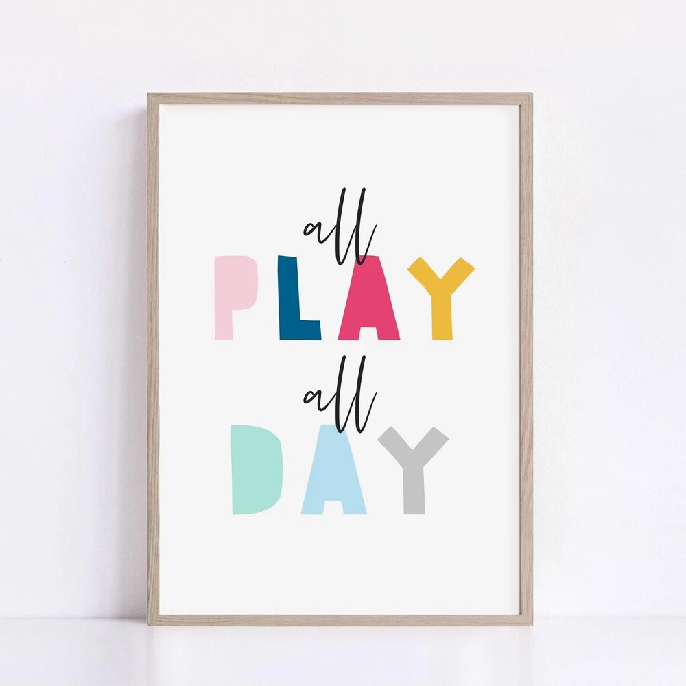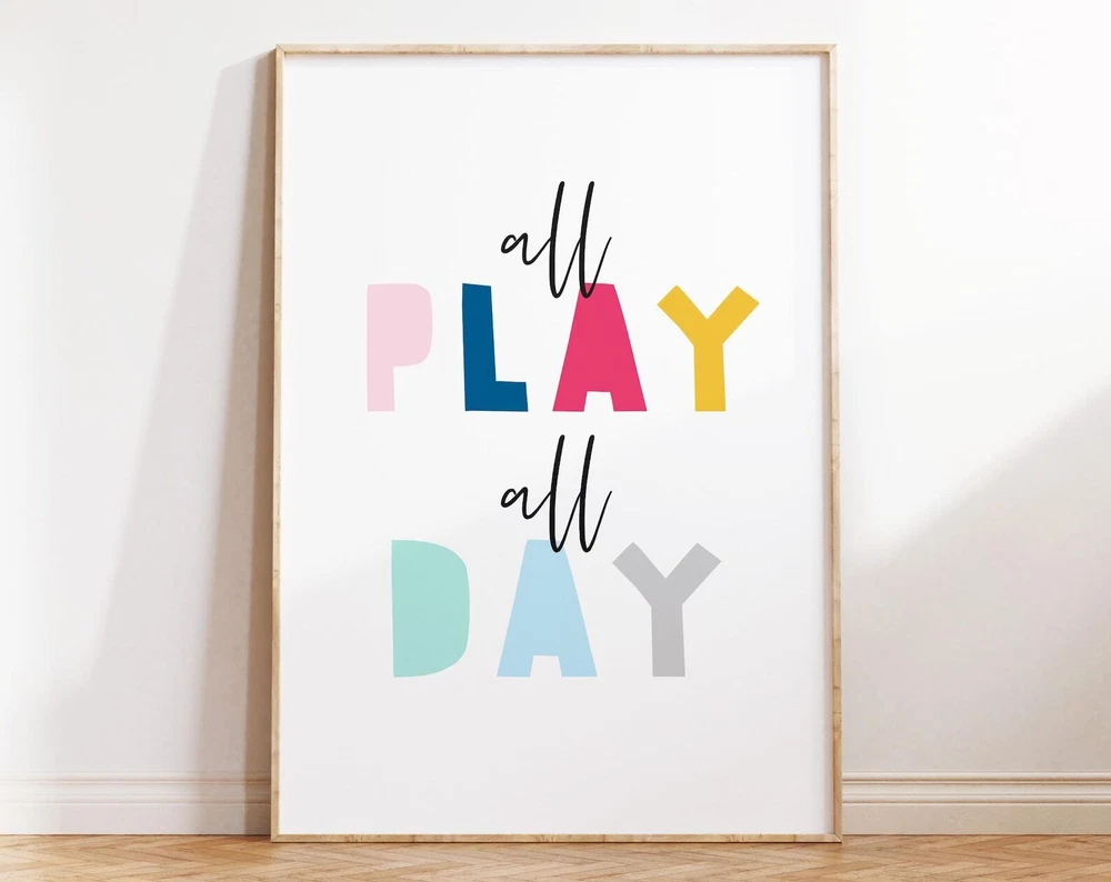 Wall Art For Kids Room Decor All Play All Day Print Nursery Wall Decor Printable Poster Children Playroom Decor Signs Material: Premium luster photo paper Print type: Inkjet printing One side printed + The finish provides the highest possible resolution and color saturation + Lasts up to 200 years in color and 400 years in black-and-white + Printed on high-quality resin-coated photo base paper medium + Posters can be hung with double-sided tape, tacks, or framed + Hand washing with a gentle cry cloth is recommended for extended durability I will hand select the best choice of paper for your chosen design to ensure top quality results for a beautiful, bright and luxurious print. All prints are sealed in cellophane slips for protection during transportation, and are shipped in a protective cardboard envelope.