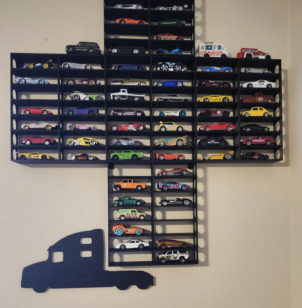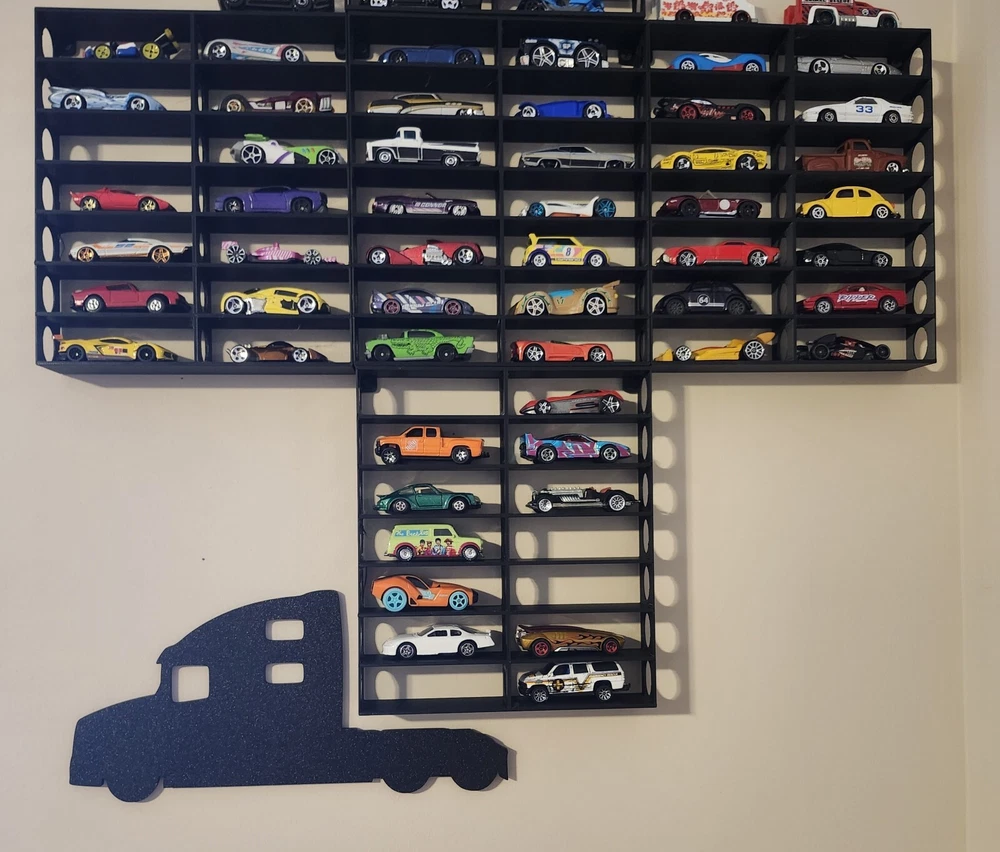 Made in the USA This can stand alone but I like it with my wall mounts Adds a nice touch for a collection display or kids room. Its pretty Large at 11.5 inches long by 5.5 inches tall Cars and Car mounts are not included this is for the truck only.