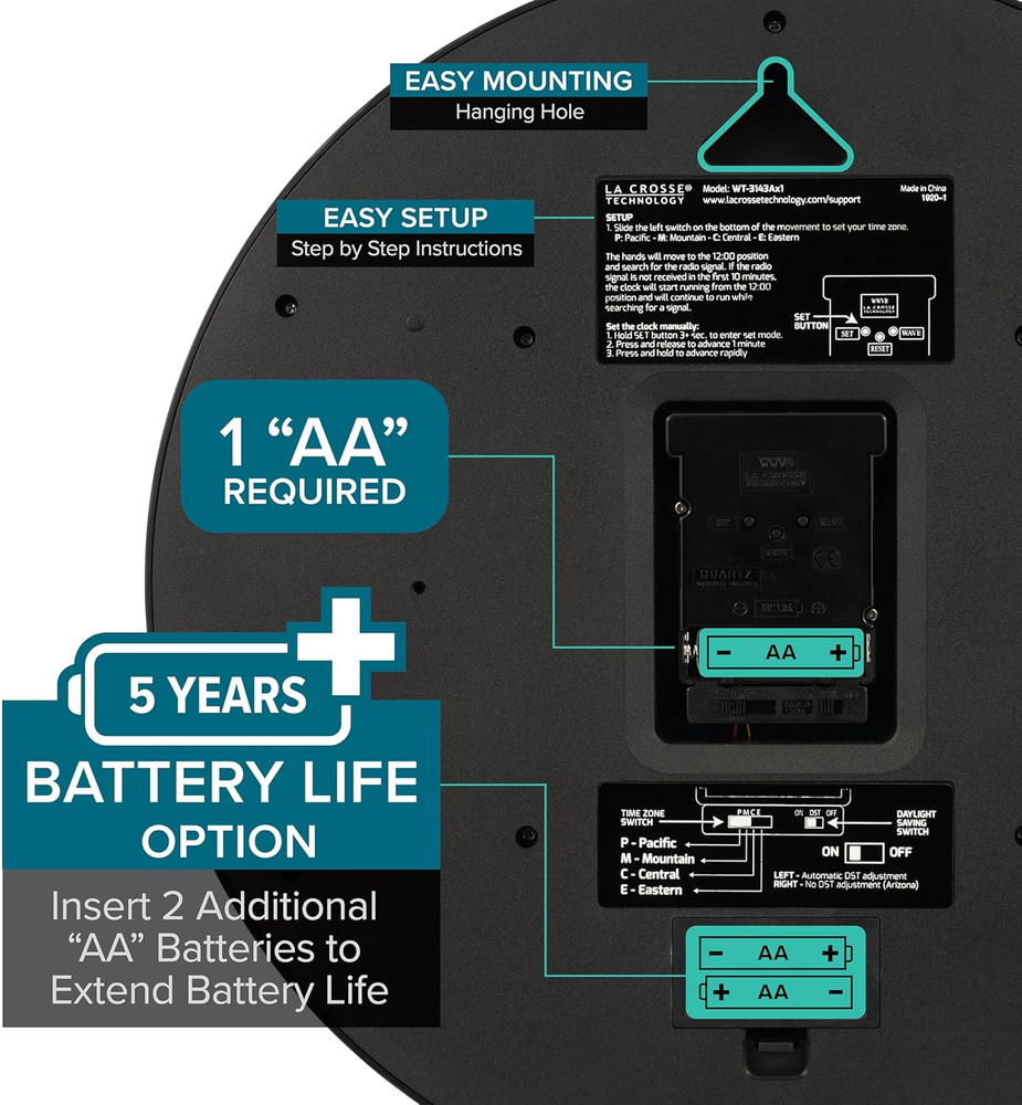 Country of Origin: China gtin13: 7445017910967 Item model number: WT-3143A-INT Style: Wall Clock Black Frame Material: Plastic Warranty Type: Limited Material: Plastic Manufacturer: , Ltd. Operation Mode: Atomic Shape: Round Batteries: 1 AA batteries required. Batteries required: Yes Item Weight: 2.85 pounds Number of Items: 1 Color: Black Dial Color: White Is Discontinued By Manufacturer: No Number of pieces: 1 Number of Batteries: 1 AA batteries required. Included Components: clock^instructions Age Range (Description): Adult Indoor/Outdoor Usage: Indoor Product Dimensions: 14"W x 14"H Warranty Description: 1 year limited warranty. Power Source: Battery Powered Type: Does not apply Watch Movement: Atomic time Alarm Clock: No Size: 1 Pack Assembly required: No Room Type: Kitchen, Living Room, Classroom, Home Office Theme: Modern Diameter: 14 Inches Display Type: Analog Global Trade Identification Number: 00757456985442 Are Batteries Included: No Special Feature: Large Display, Multiple Time Zone, Daylight Saving, Atomic Brand: Does not apply UPC: 7445017910967 Mounting Type: Wall Mount